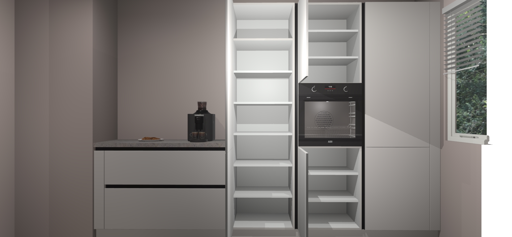 Een stijlvolle en praktische keuken als deze mag gezien worden. Dankzij de prachtige Zijdegrijze matte afwerking wordt de keuken gemakkelijk het middelpunt van uw huis - hij ziet er geweldig uit onder allerlei lichtomstandigheden, van dag tot nacht!