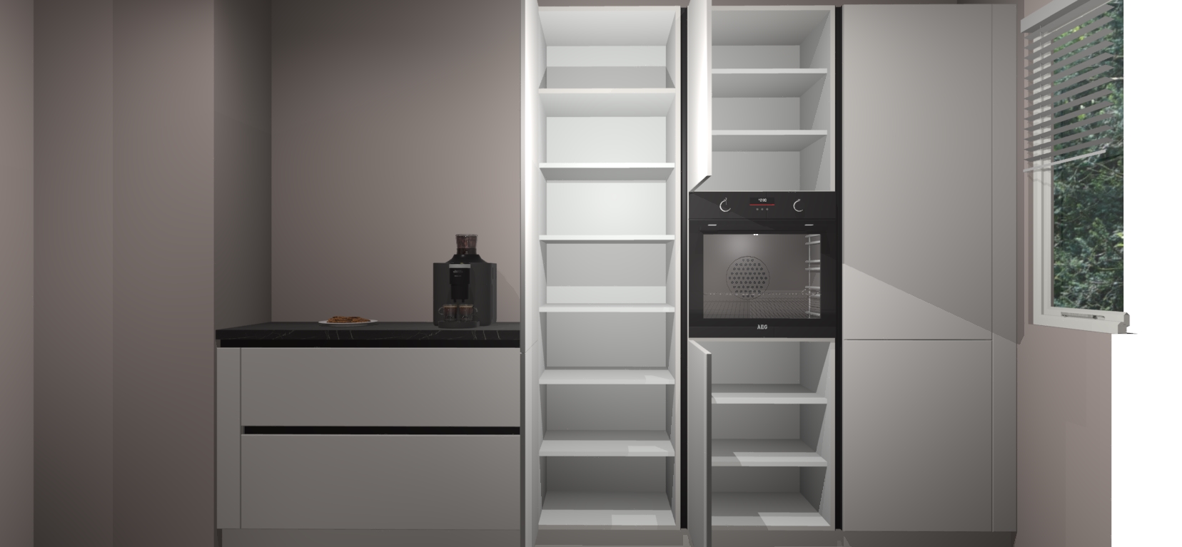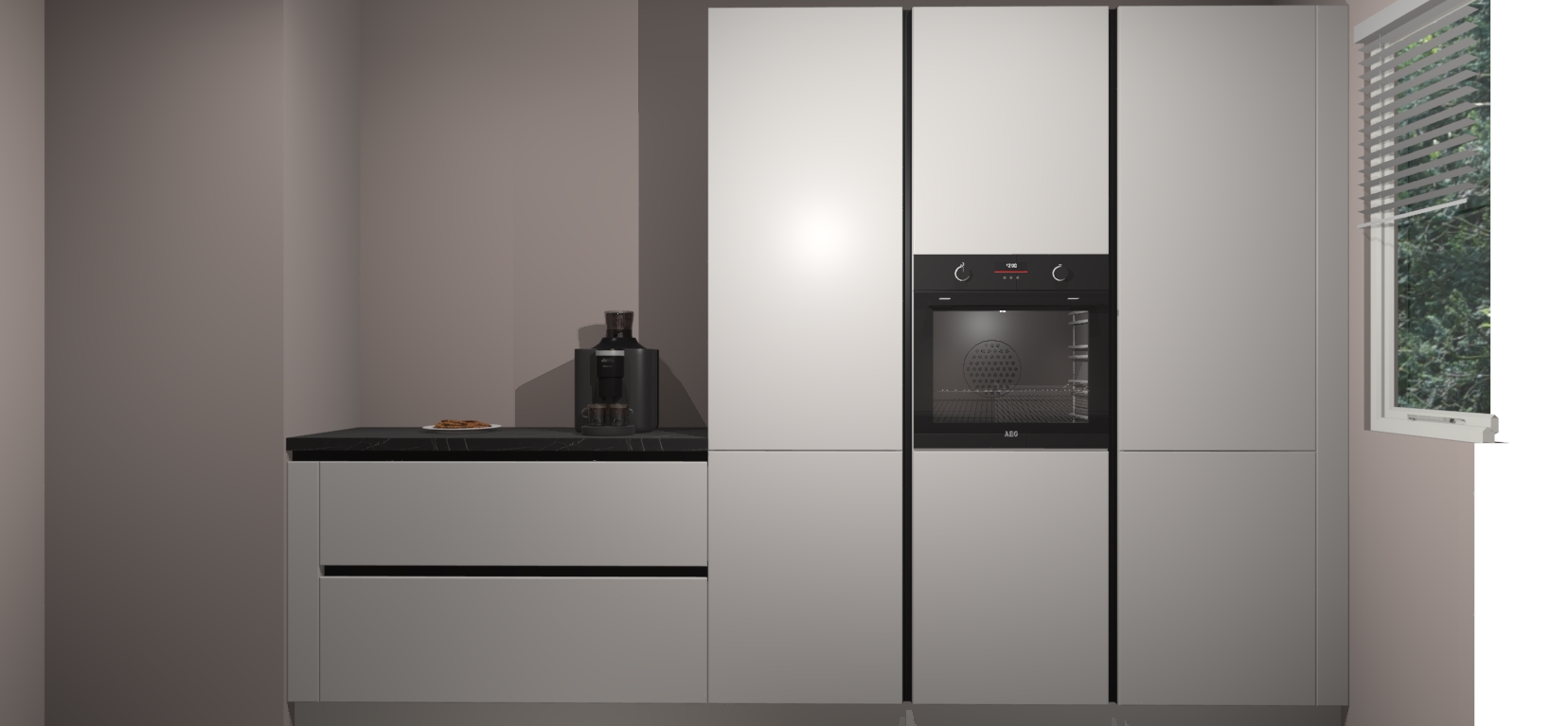 Een stijlvolle en praktische keuken als deze mag gezien worden. Dankzij de prachtige Zijdegrijze matte afwerking wordt de keuken gemakkelijk het middelpunt van uw huis - hij ziet er geweldig uit onder allerlei lichtomstandigheden, van dag tot nacht!