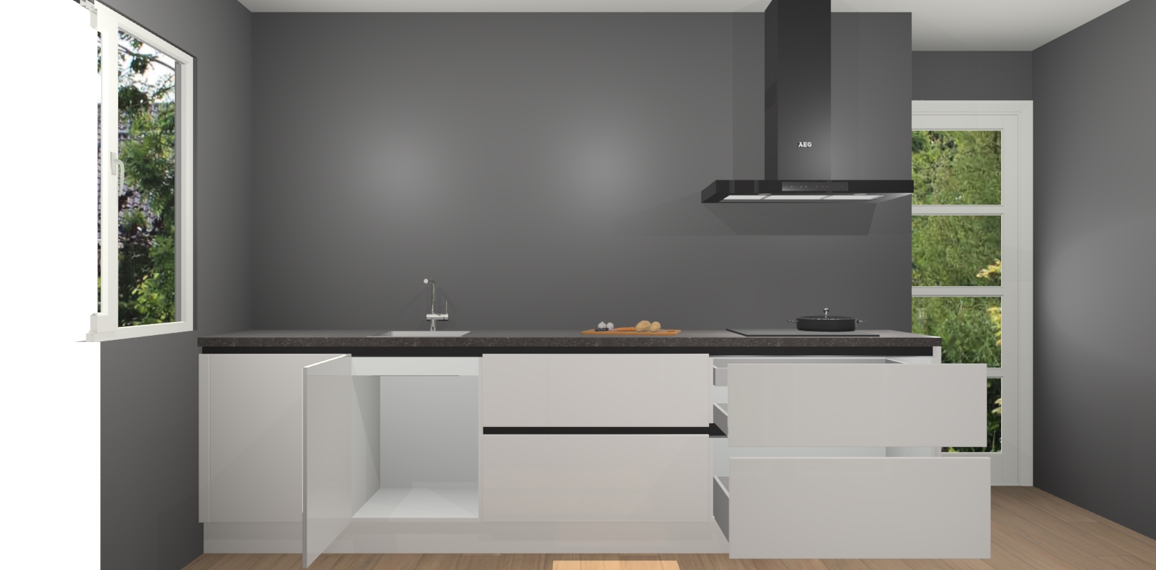 De softclose deuren openen en sluiten is ook heel eenvoudig - geniet van een moeiteloze keukenervaring, zelfs als er kinderen rondlopen. Voor extra gemak bij het plaatsen van uw bestelling bieden we ook een upgrade naar een kookplaat met geïntegreerde afzuiging.