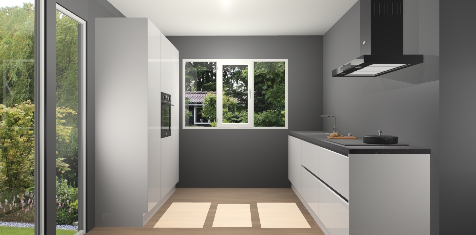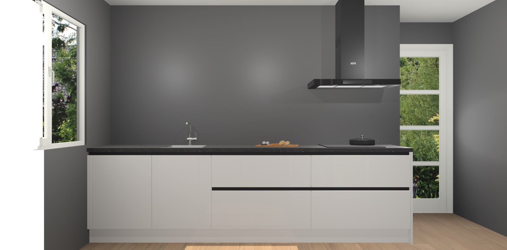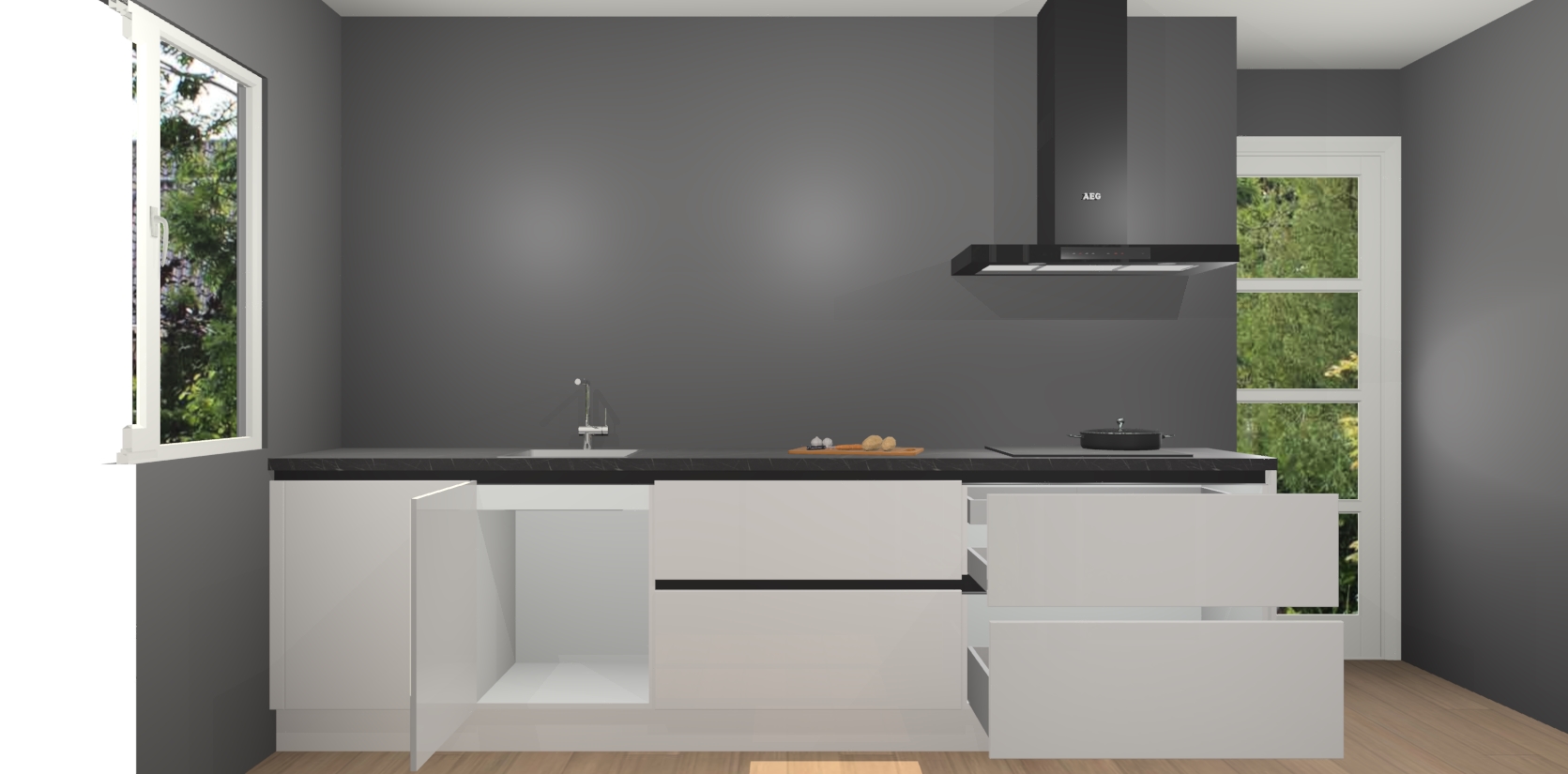 De softclose deuren openen en sluiten is ook heel eenvoudig - geniet van een moeiteloze keukenervaring, zelfs als er kinderen rondlopen. Voor extra gemak bij het plaatsen van uw bestelling bieden we ook een upgrade naar een kookplaat met geïntegreerde afzuiging.