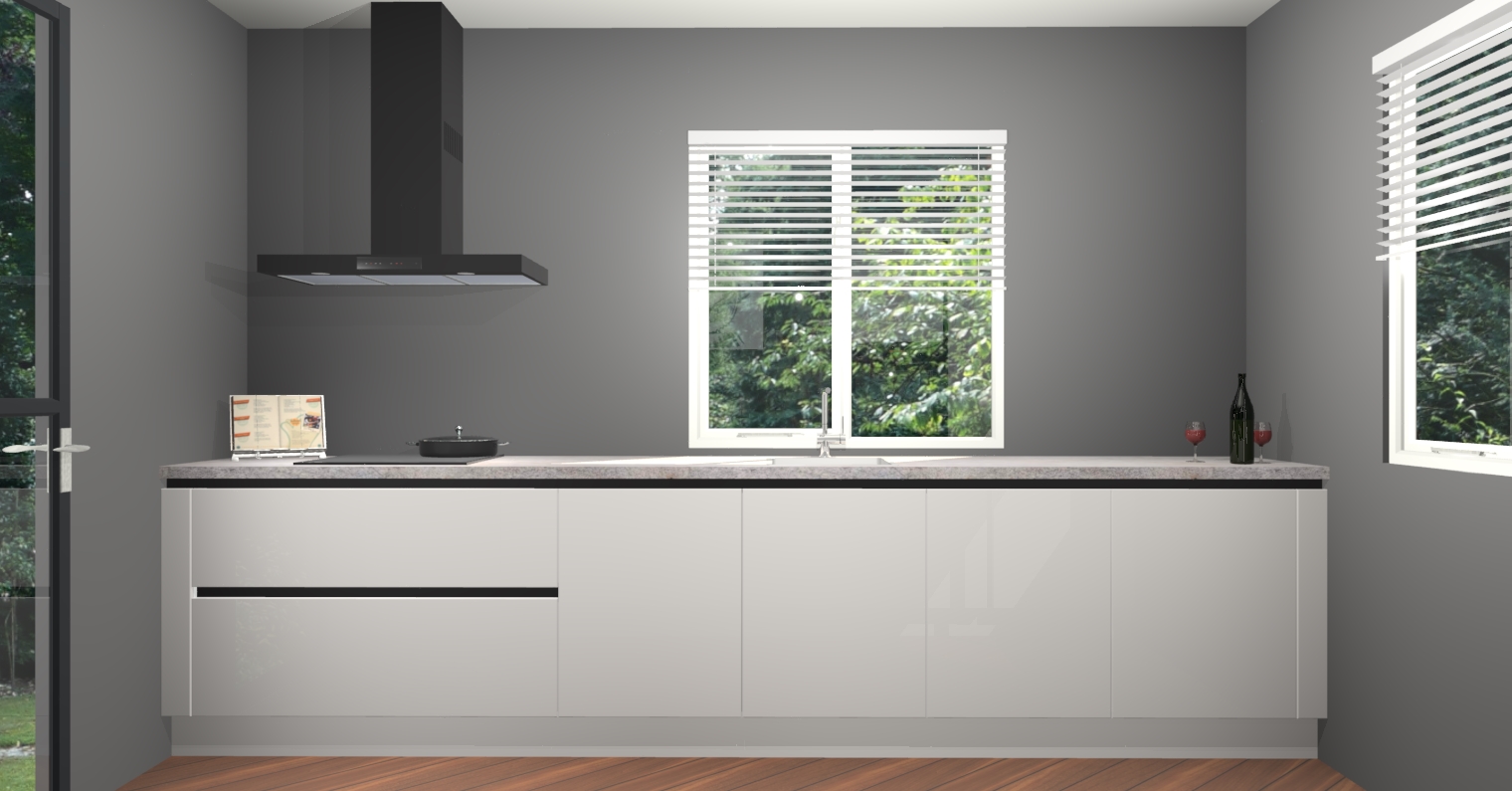 Welkom bij de Zijdegrijze hoogglans greeploze keuken Lusaka. Deze prachtige keuken zal de komende jaren het middelpunt van de belangstelling in uw huis zijn. Uitgerust met vijf inbouwapparaten komt u nooit kookgereedschap tekort. Bovendien geeft de warme houtlook elke ruimte een uitnodigende en tijdloze uitstraling.