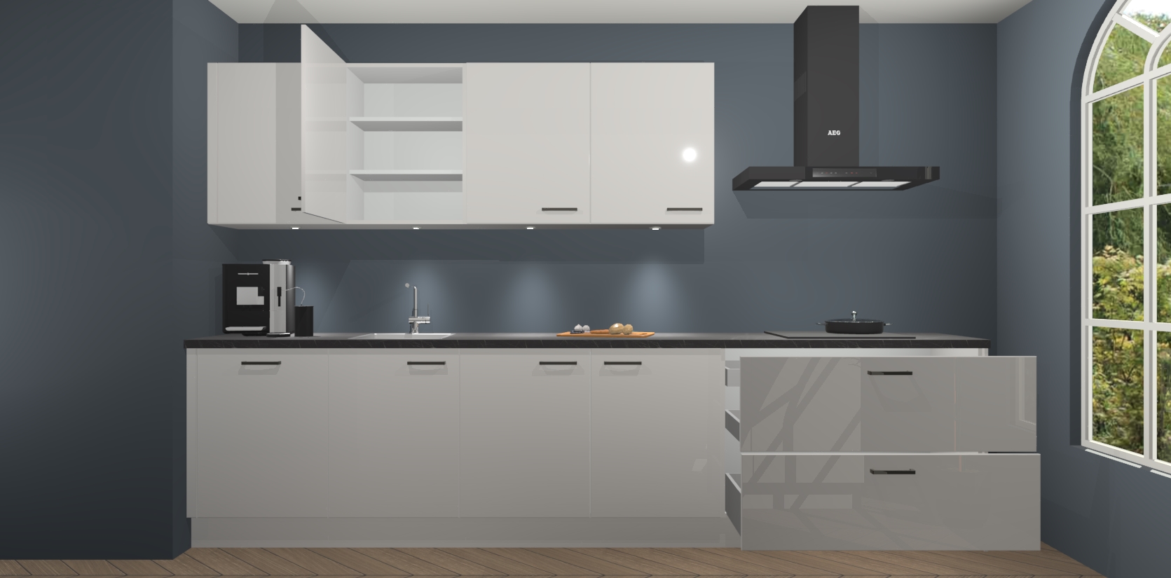 De softclose deuren openen en sluiten is ook heel eenvoudig - geniet van een moeiteloze keukenervaring, zelfs als er kinderen rondlopen. Voor extra gemak bij het plaatsen van uw bestelling bieden we ook een upgrade naar een kookplaat met geïntegreerde afzuiging.