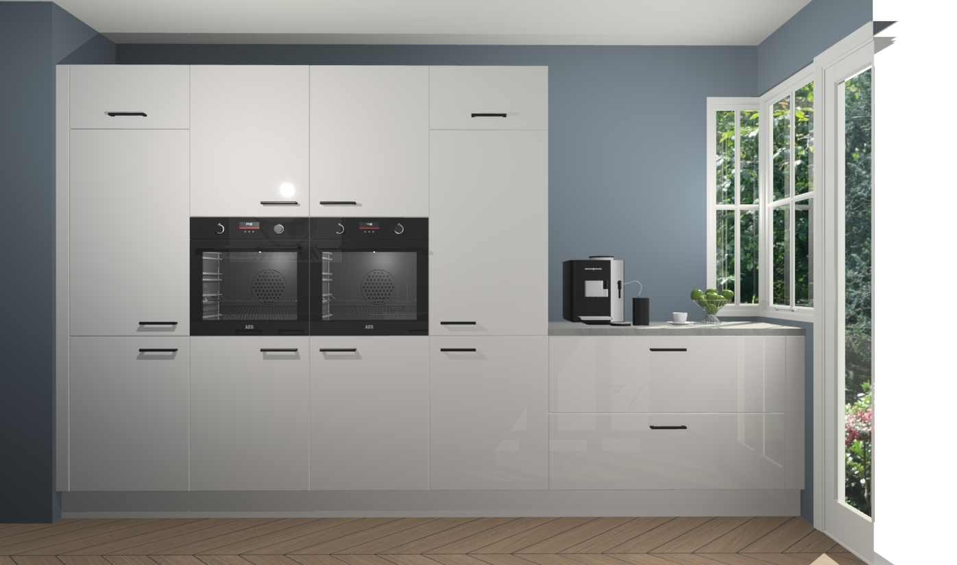 Een stijlvolle en praktische keuken als deze mag gezien worden. Dankzij de prachtige zijdegrijze hoogglans afwerking wordt de keuken gemakkelijk het middelpunt van uw huis - hij ziet er geweldig uit onder allerlei lichtomstandigheden, van dag tot nacht!