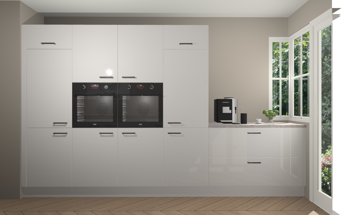 Een stijlvolle en praktische keuken als deze mag gezien worden. Dankzij de prachtige zijdegrijze hoogglans afwerking wordt de keuken gemakkelijk het middelpunt van uw huis - hij ziet er geweldig uit onder allerlei lichtomstandigheden, van dag tot nacht!