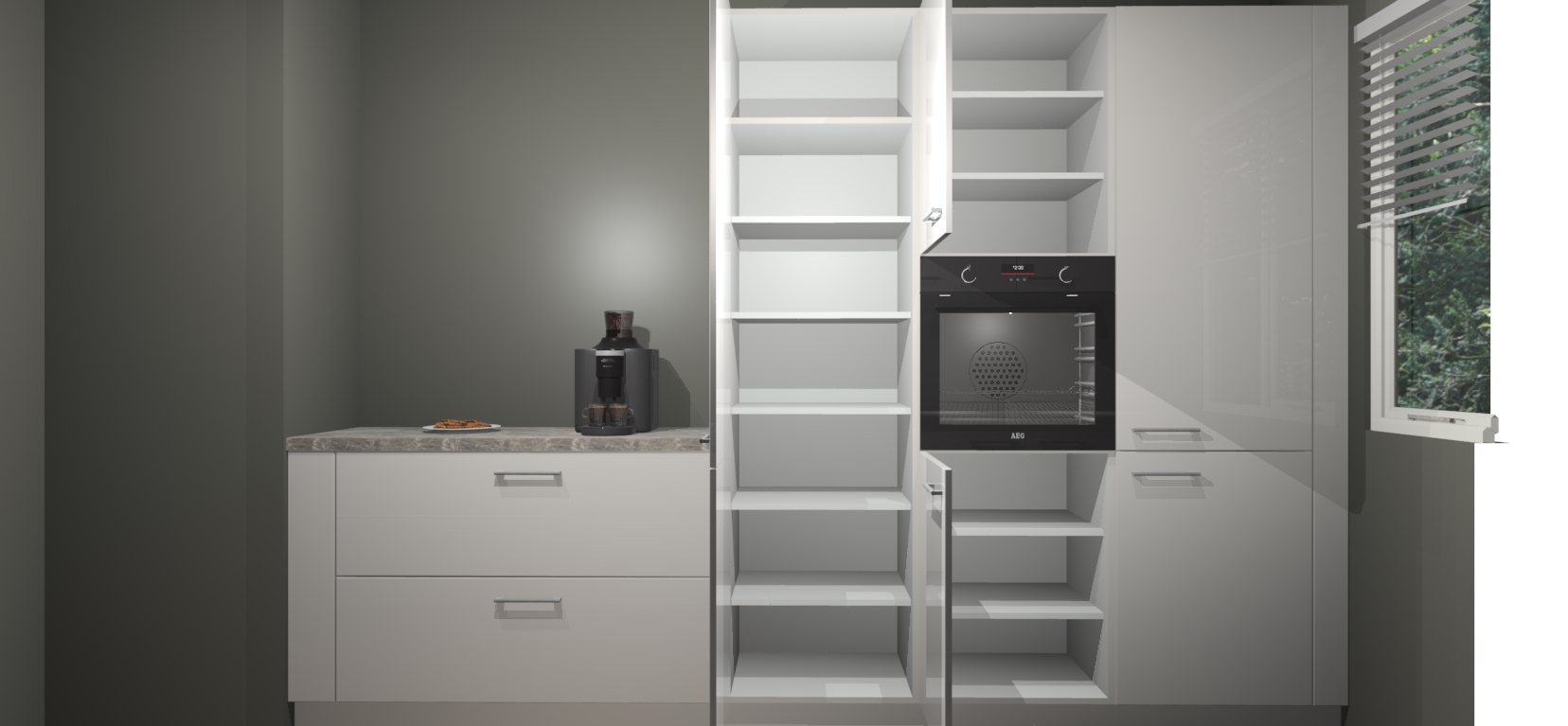 Een stijlvolle en praktische keuken als deze mag gezien worden. Dankzij de prachtige Zijdegrijze hoogglans afwerking wordt de keuken gemakkelijk het middelpunt van uw huis - hij ziet er geweldig uit onder allerlei lichtomstandigheden, van dag tot nacht!