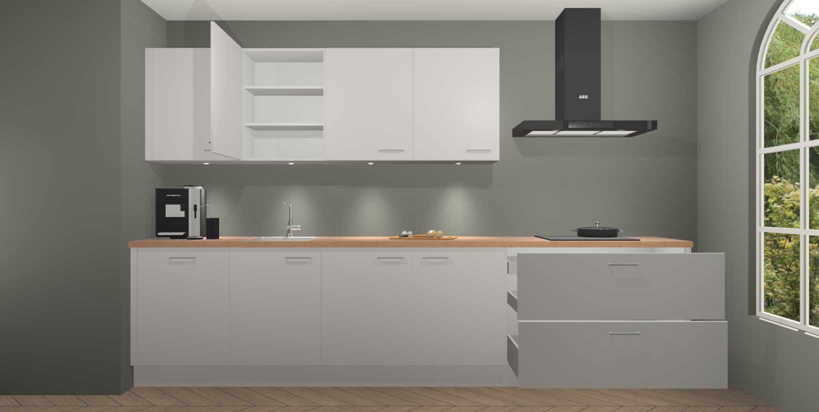 De softclose deuren openen en sluiten is ook heel eenvoudig - geniet van een moeiteloze keukenervaring, zelfs als er kinderen rondlopen. Voor extra gemak bij het plaatsen van uw bestelling bieden we ook een upgrade naar een kookplaat met geïntegreerde afzuiging.