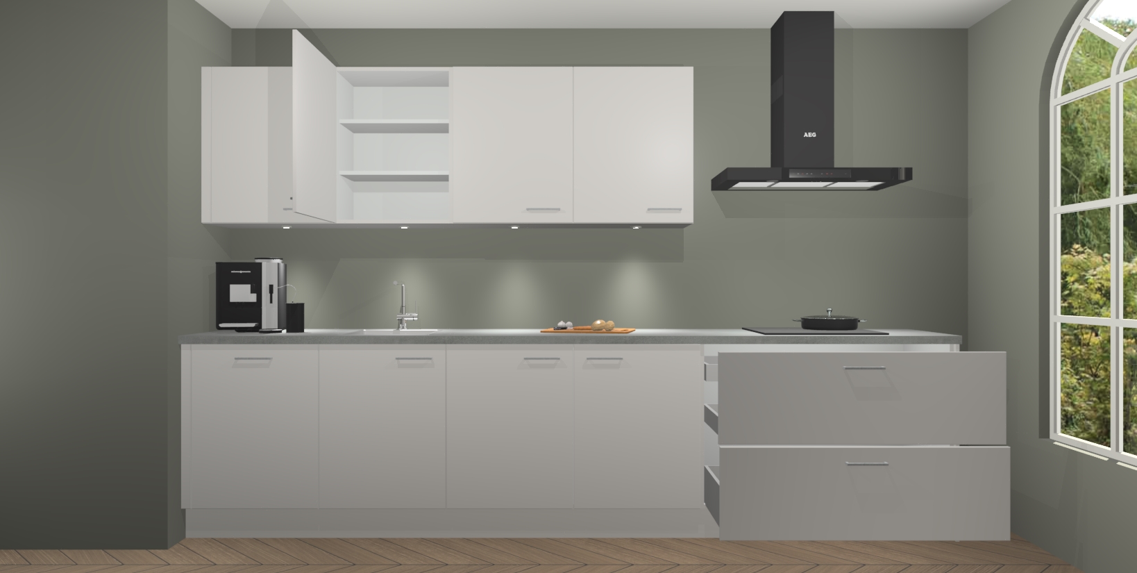 De softclose deuren openen en sluiten is ook heel eenvoudig - geniet van een moeiteloze keukenervaring, zelfs als er kinderen rondlopen. Voor extra gemak bij het plaatsen van uw bestelling bieden we ook een upgrade naar een kookplaat met geïntegreerde afzuiging.