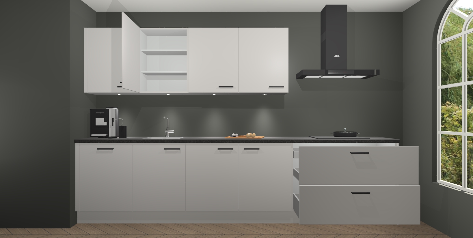 De softclose deuren openen en sluiten is ook heel eenvoudig - geniet van een moeiteloze keukenervaring, zelfs als er kinderen rondlopen. Voor extra gemak bij het plaatsen van uw bestelling bieden we ook een upgrade naar een kookplaat met geïntegreerde afzuiging.