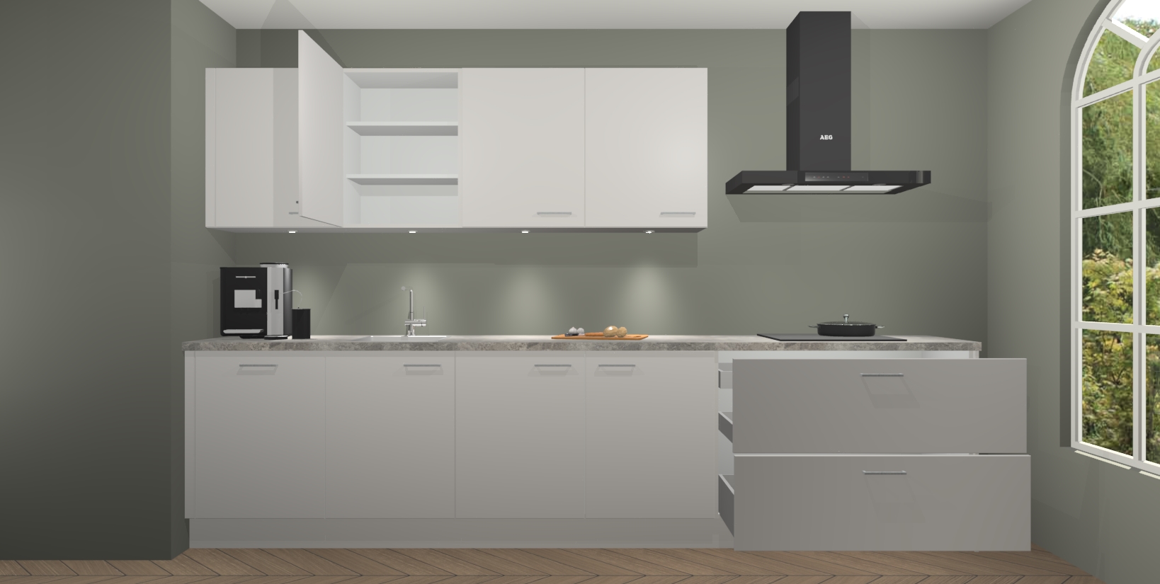 De softclose deuren openen en sluiten is ook heel eenvoudig - geniet van een moeiteloze keukenervaring, zelfs als er kinderen rondlopen. Voor extra gemak bij het plaatsen van uw bestelling bieden we ook een upgrade naar een kookplaat met geïntegreerde afzuiging.