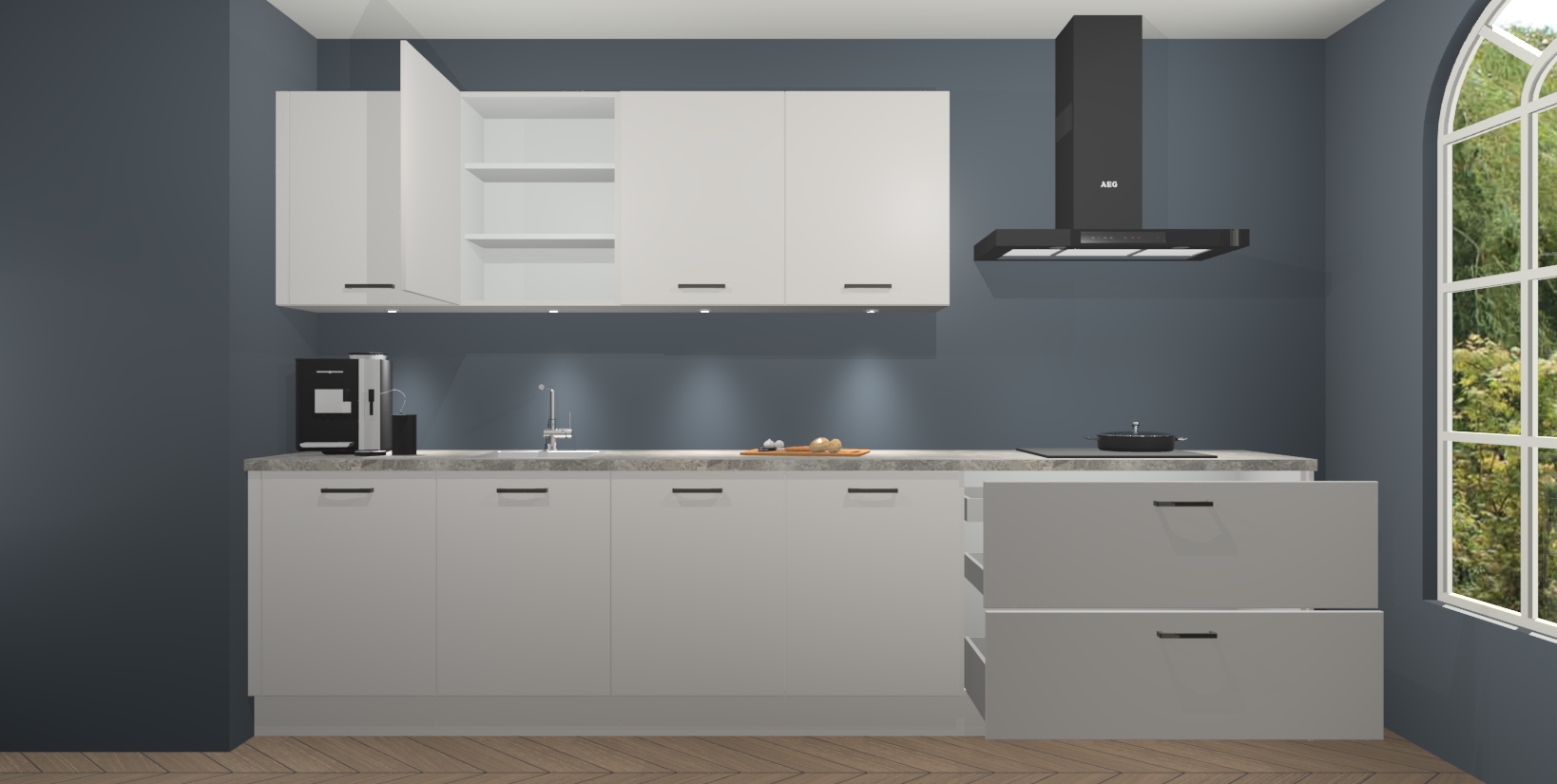 De softclose deuren openen en sluiten is ook heel eenvoudig - geniet van een moeiteloze keukenervaring, zelfs als er kinderen rondlopen. Voor extra gemak bij het plaatsen van uw bestelling bieden we ook een upgrade naar een kookplaat met geïntegreerde afzuiging.