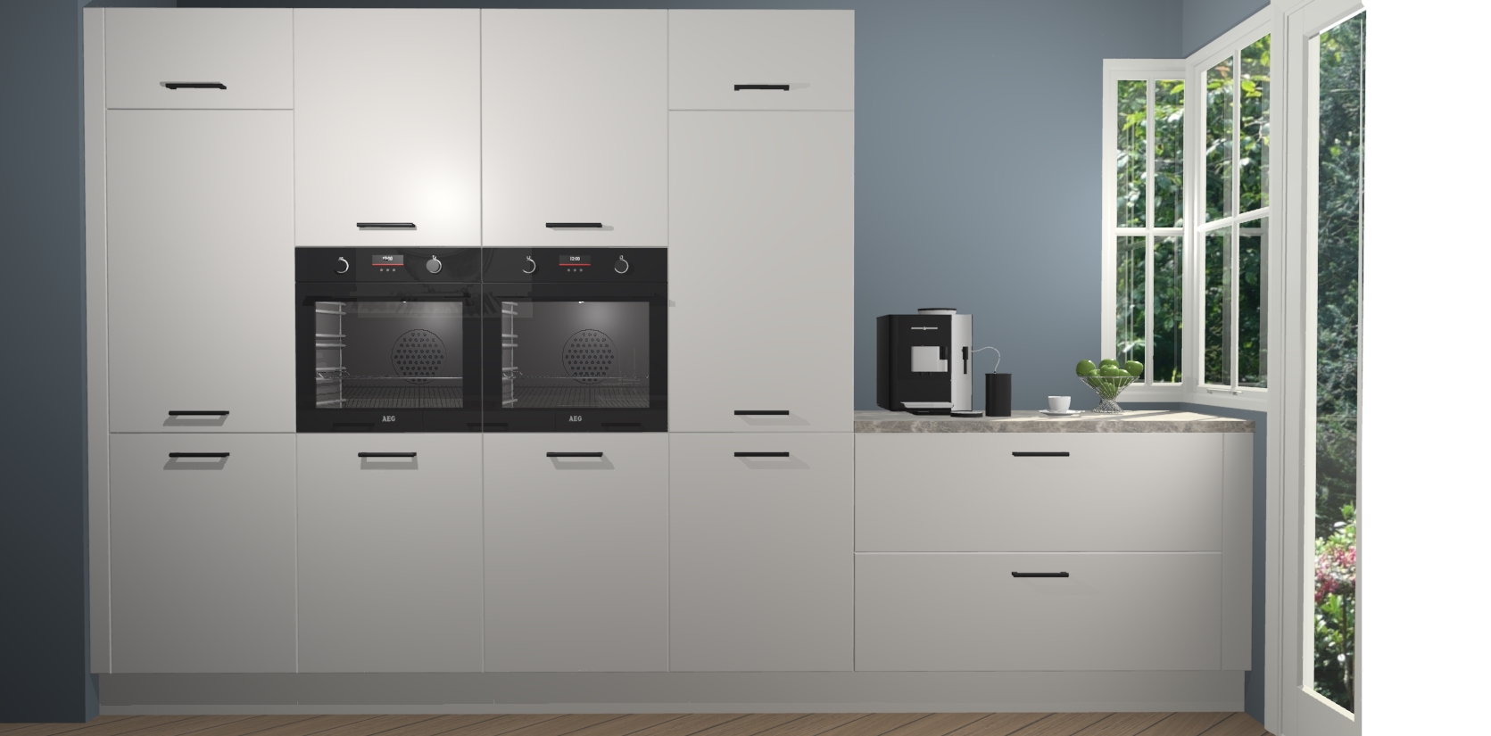 Een stijlvolle en praktische keuken als deze mag gezien worden. Dankzij de prachtige zijdegrijze matte afwerking wordt de keuken gemakkelijk het middelpunt van uw huis - hij ziet er geweldig uit onder allerlei lichtomstandigheden, van dag tot nacht!