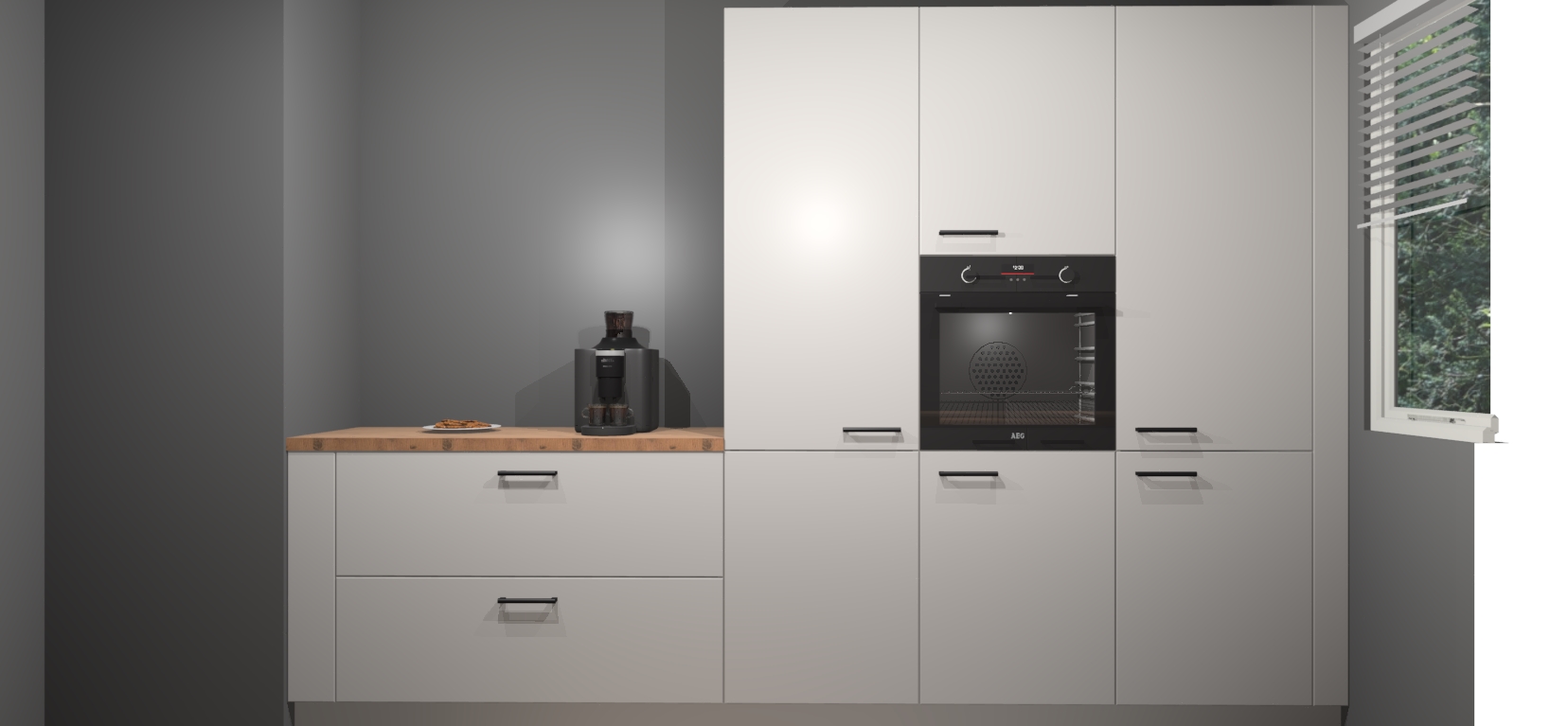 Een stijlvolle en praktische keuken als deze mag gezien worden. Dankzij de prachtige Zijdegrijze matte afwerking wordt de keuken gemakkelijk het middelpunt van uw huis - hij ziet er geweldig uit onder allerlei lichtomstandigheden, van dag tot nacht!