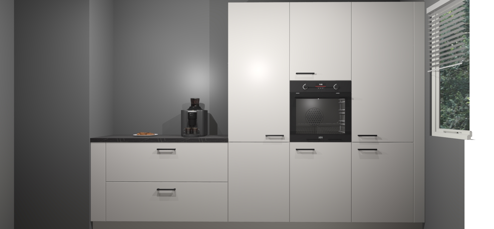 Een stijlvolle en praktische keuken als deze mag gezien worden. Dankzij de prachtige Zijdegrijze matte afwerking wordt de keuken gemakkelijk het middelpunt van uw huis - hij ziet er geweldig uit onder allerlei lichtomstandigheden, van dag tot nacht!