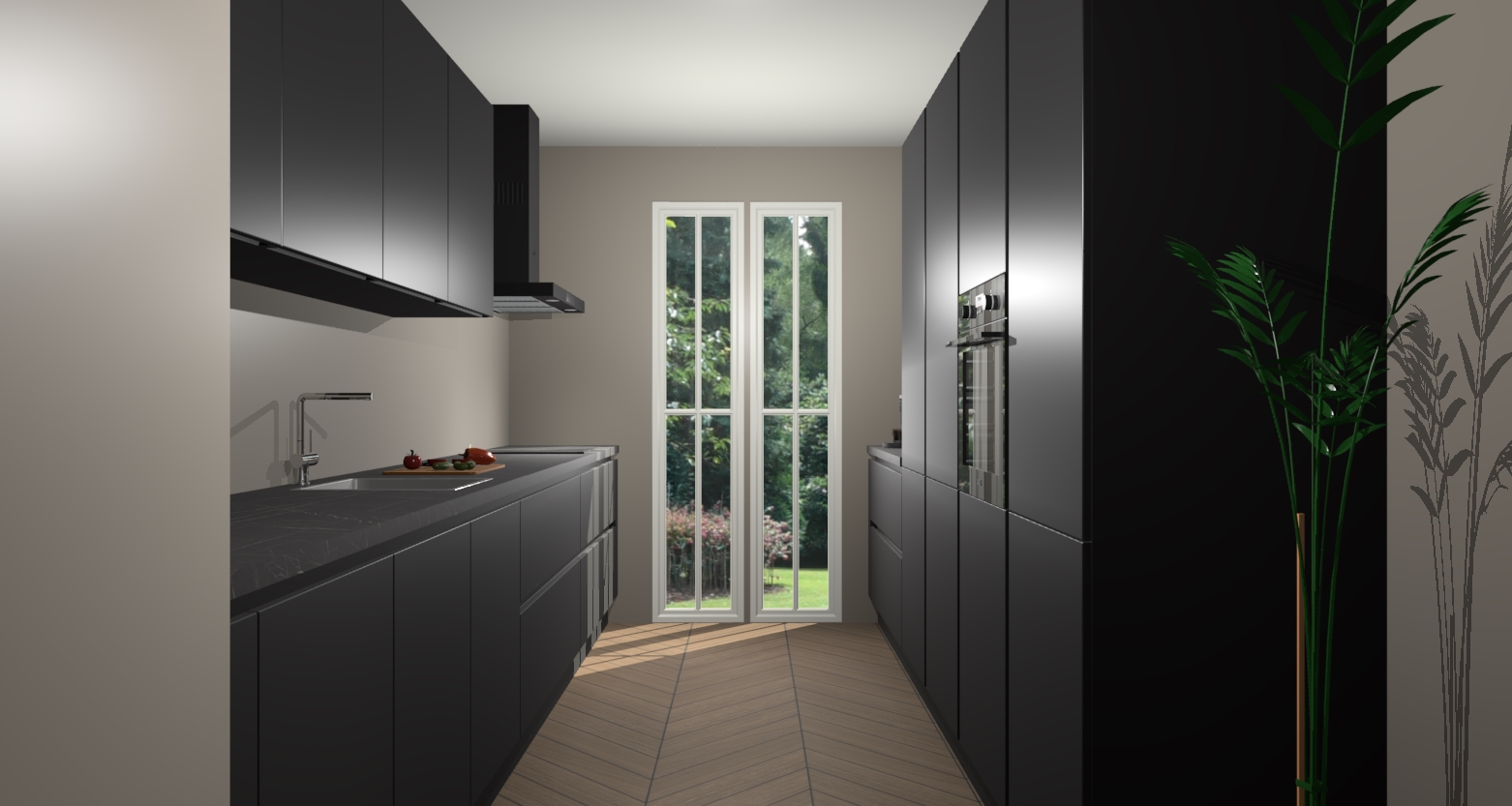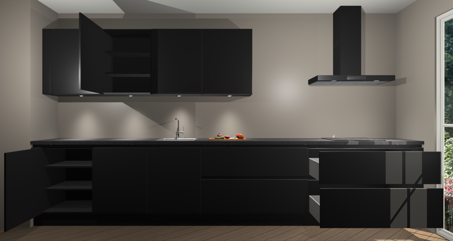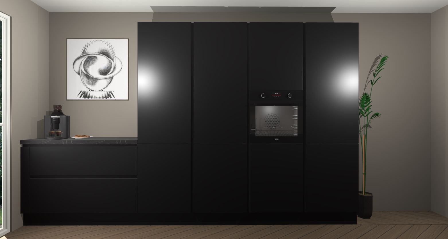 Een stijlvolle en praktische keuken als deze mag gezien worden. Dankzij de prachtige zwarte matte afwerking wordt de keuken gemakkelijk het middelpunt van uw huis - hij ziet er geweldig uit onder allerlei lichtomstandigheden, van dag tot nacht!