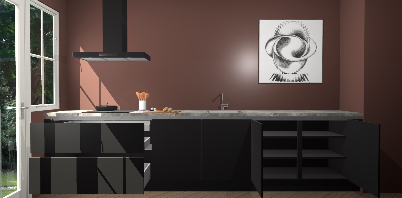 Een stijlvolle en praktische keuken als deze mag gezien worden. Dankzij de prachtige zwarte matte afwerking wordt de keuken gemakkelijk het middelpunt van uw huis - hij ziet er geweldig uit onder allerlei lichtomstandigheden, van dag tot nacht!