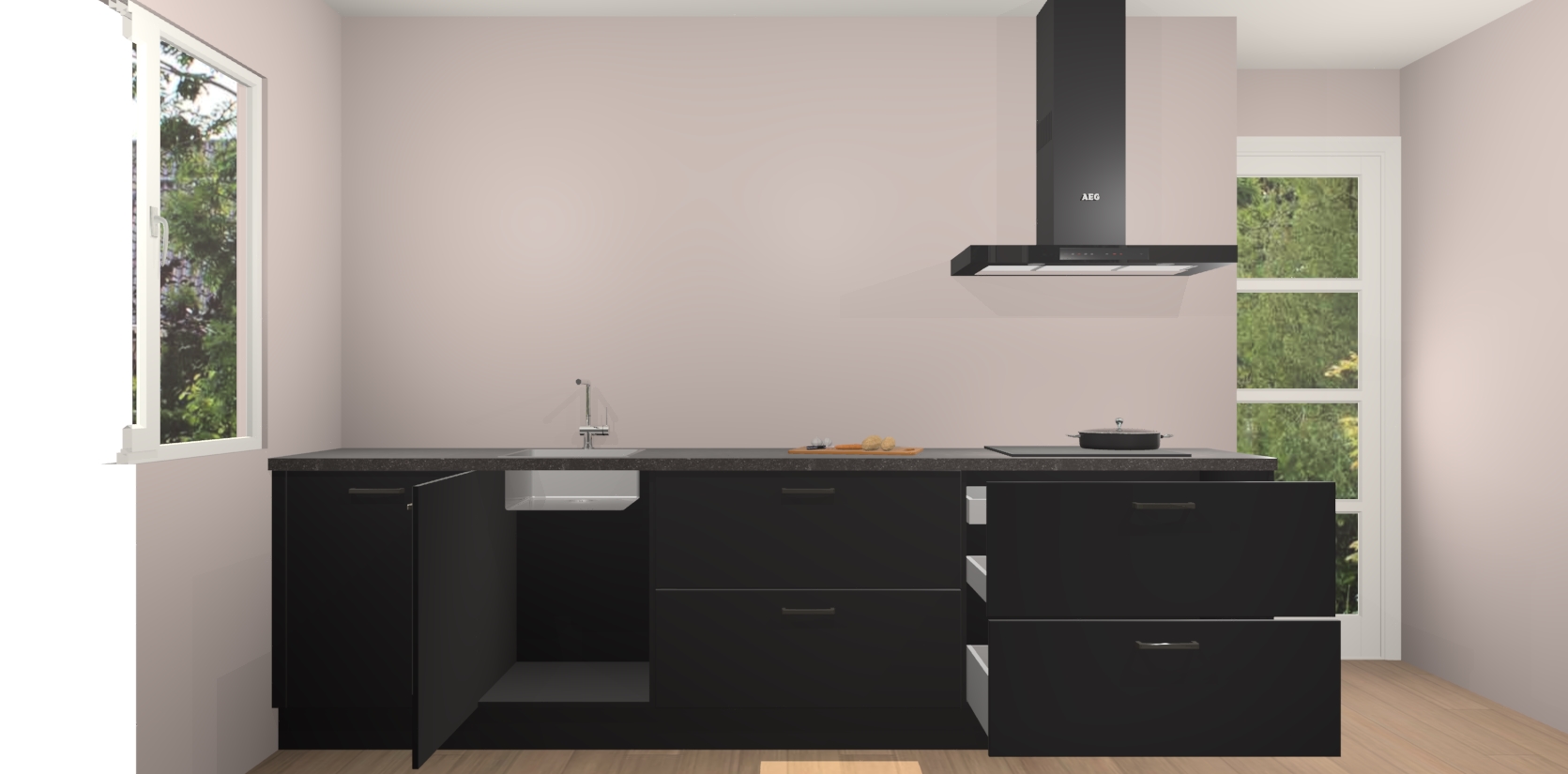 De softclose deuren openen en sluiten is ook heel eenvoudig - geniet van een moeiteloze keukenervaring, zelfs als er kinderen rondlopen. Voor extra gemak bij het plaatsen van uw bestelling bieden we ook een upgrade naar een kookplaat met geïntegreerde afzuiging.
