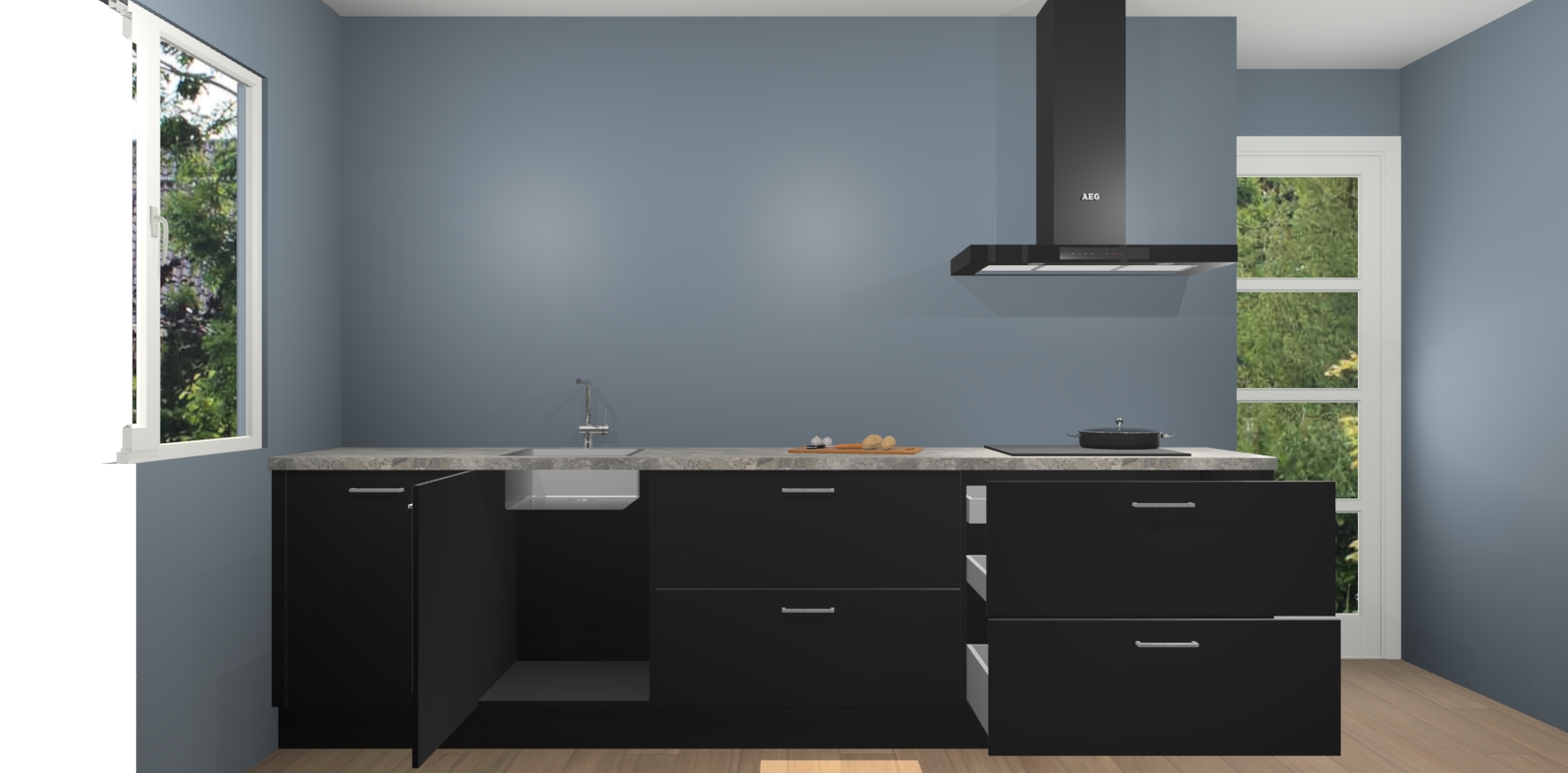 De softclose deuren openen en sluiten is ook heel eenvoudig - geniet van een moeiteloze keukenervaring, zelfs als er kinderen rondlopen. Voor extra gemak bij het plaatsen van uw bestelling bieden we ook een upgrade naar een kookplaat met geïntegreerde afzuiging.