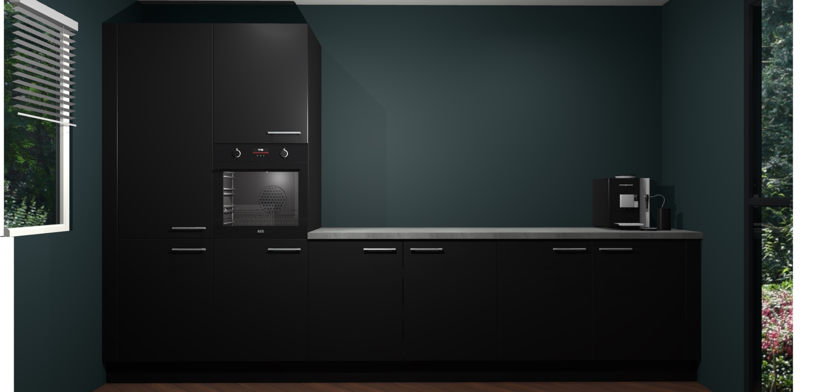 Welkom bij de Zwarte keuken Lusaka. Deze prachtige keuken zal de komende jaren het middelpunt van de belangstelling in uw huis zijn. Uitgerust met vijf inbouwapparaten komt u nooit kookgereedschap tekort. Bovendien geeft de warme houtlook elke ruimte een uitnodigende en tijdloze uitstraling.