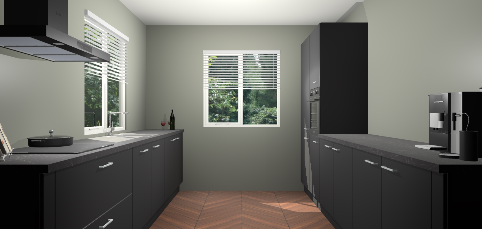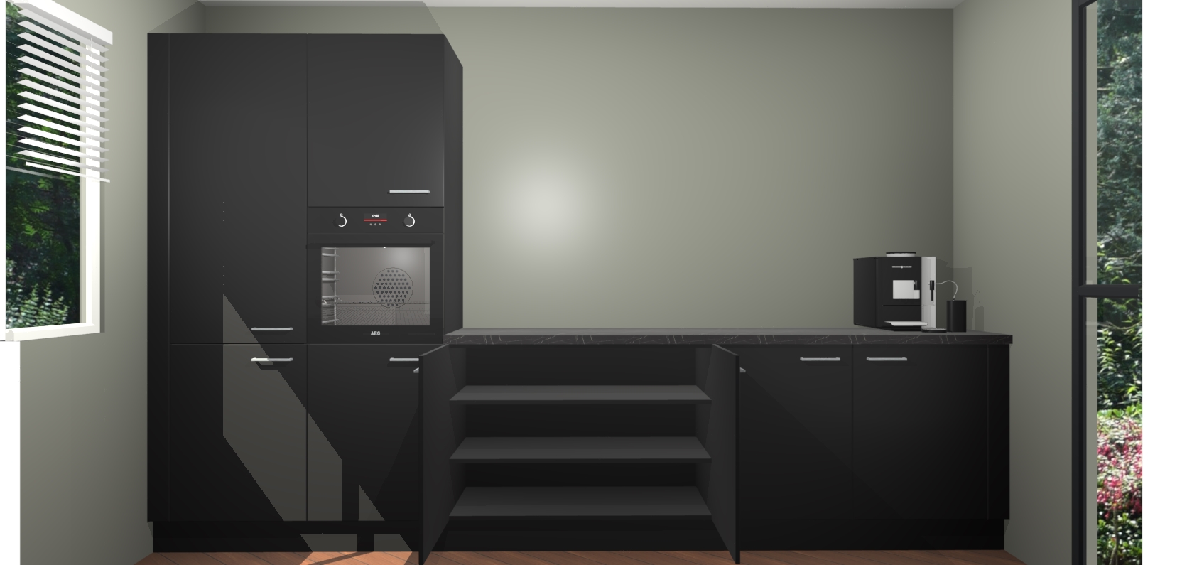 Welkom bij de Zwarte keuken Lusaka. Deze prachtige keuken zal de komende jaren het middelpunt van de belangstelling in uw huis zijn. Uitgerust met vijf inbouwapparaten komt u nooit kookgereedschap tekort. Bovendien geeft de warme houtlook elke ruimte een uitnodigende en tijdloze uitstraling.