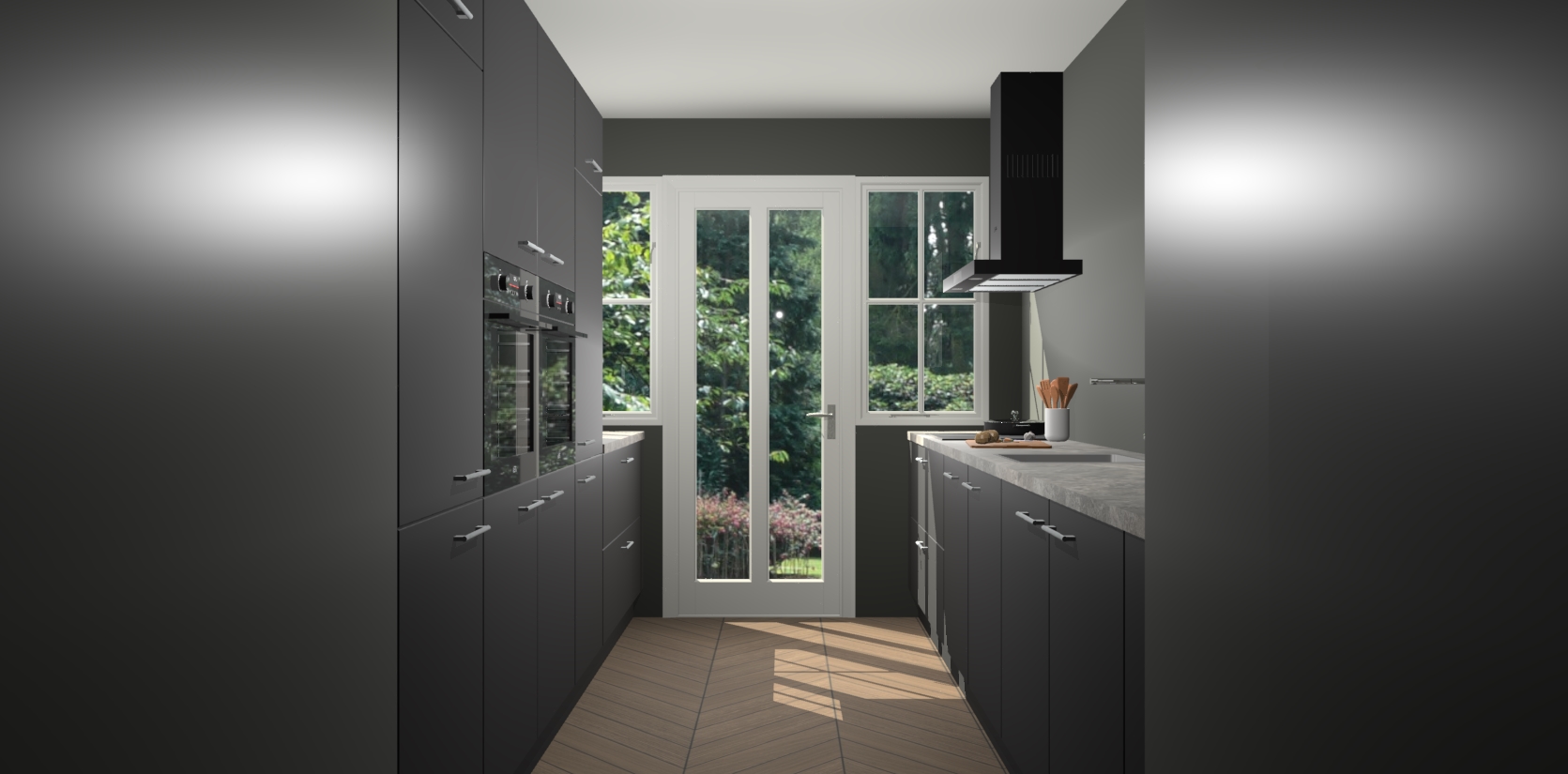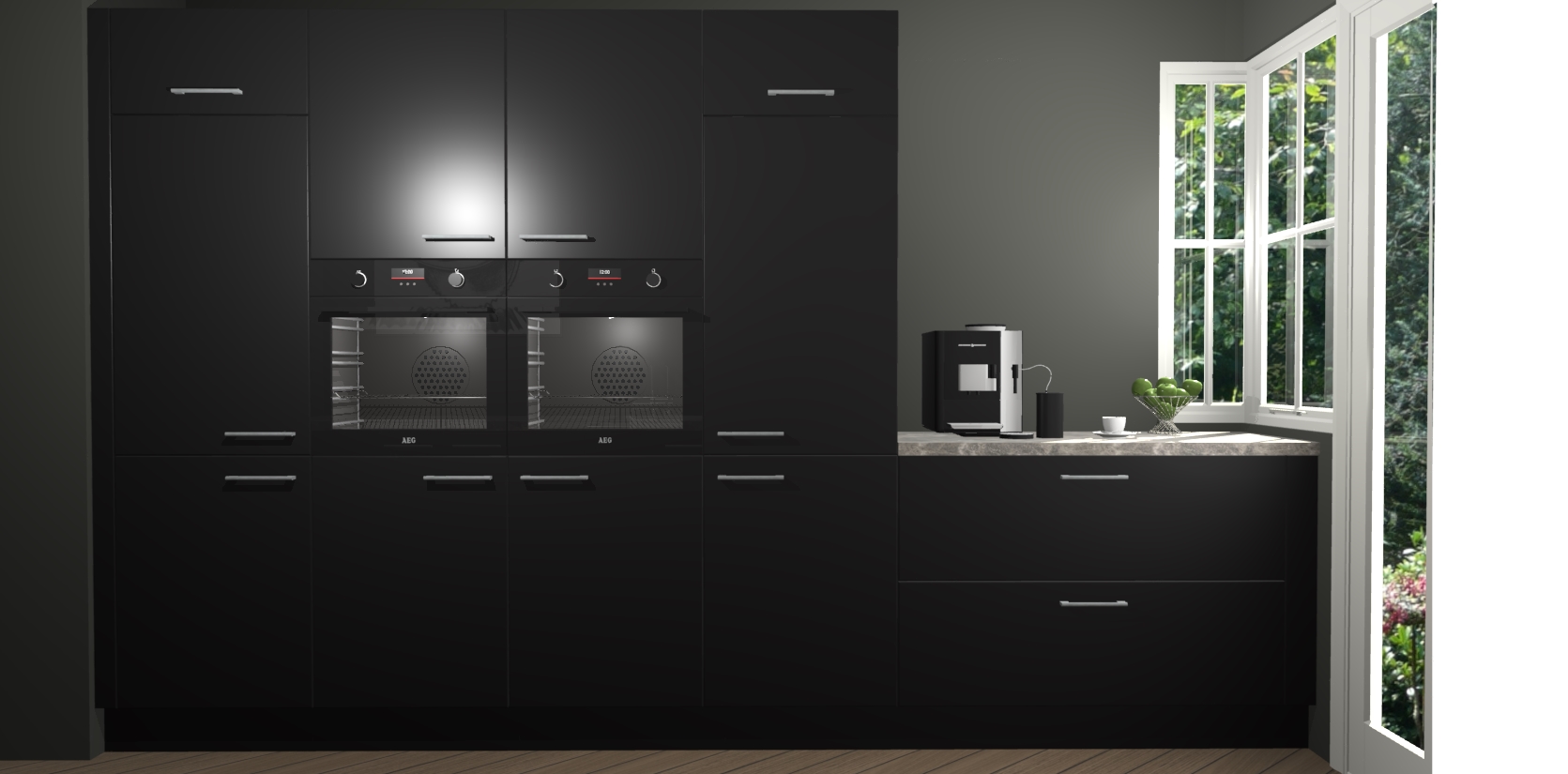 Een stijlvolle en praktische keuken als deze mag gezien worden. Dankzij de prachtige zwarte matte afwerking wordt de keuken gemakkelijk het middelpunt van uw huis - hij ziet er geweldig uit onder allerlei lichtomstandigheden, van dag tot nacht!