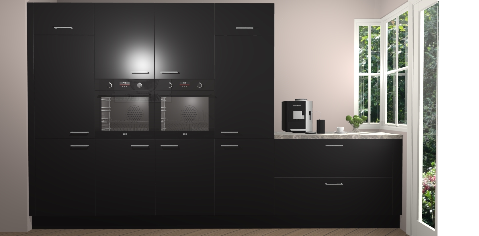 Een stijlvolle en praktische keuken als deze mag gezien worden. Dankzij de prachtige zwarte matte afwerking wordt de keuken gemakkelijk het middelpunt van uw huis - hij ziet er geweldig uit onder allerlei lichtomstandigheden, van dag tot nacht!