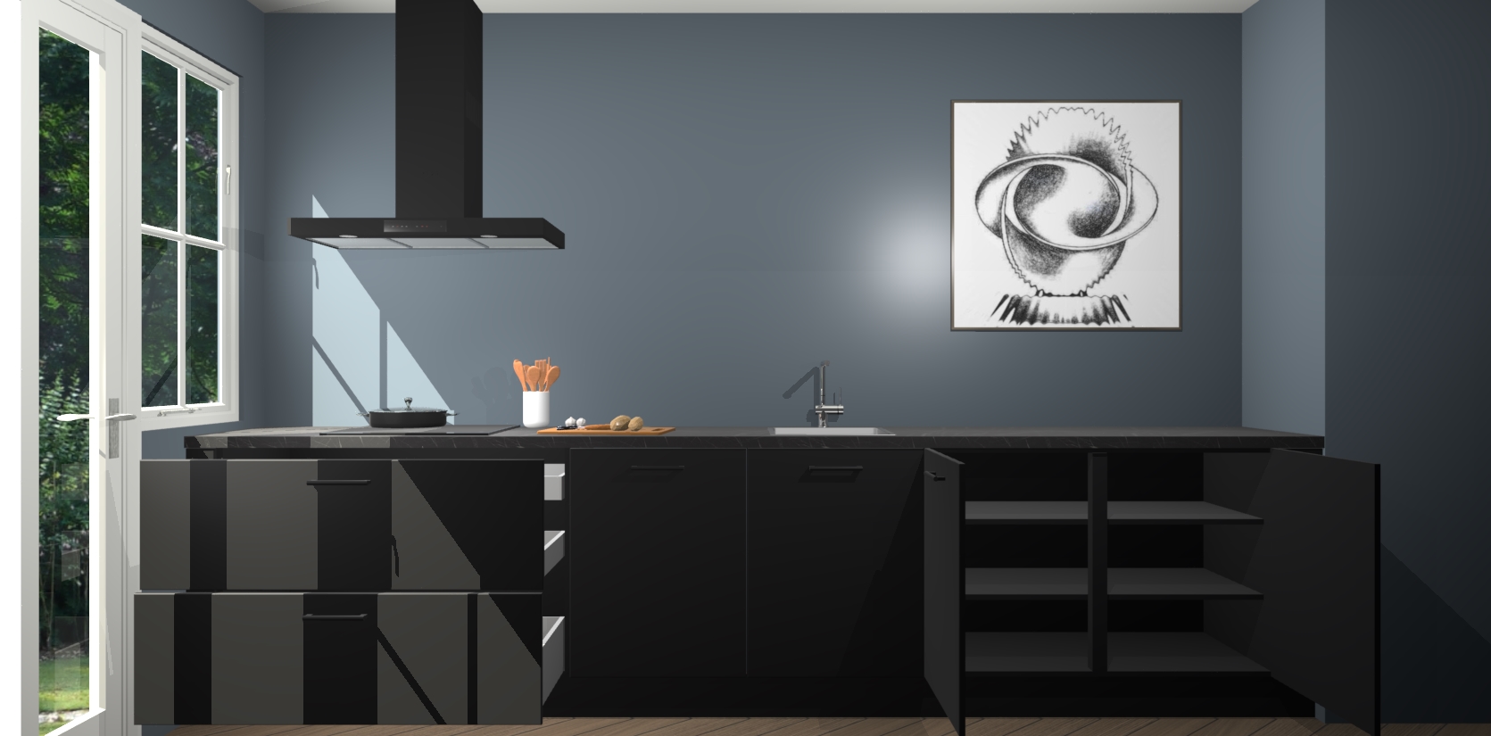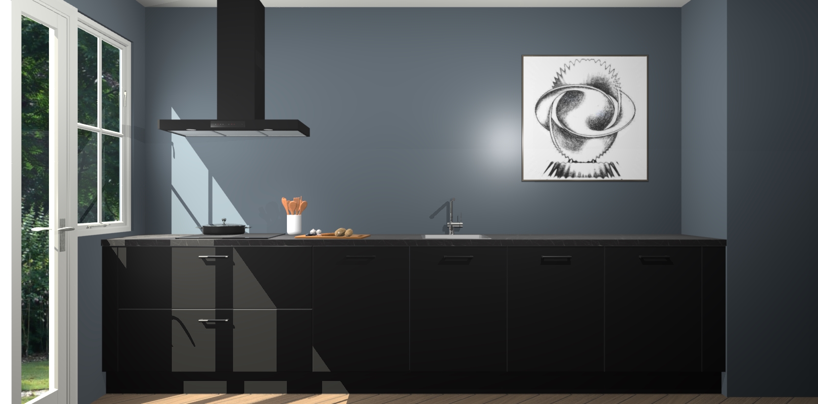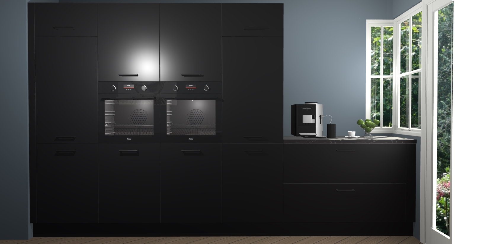 Een stijlvolle en praktische keuken als deze mag gezien worden. Dankzij de prachtige zwarte matte afwerking wordt de keuken gemakkelijk het middelpunt van uw huis - hij ziet er geweldig uit onder allerlei lichtomstandigheden, van dag tot nacht!