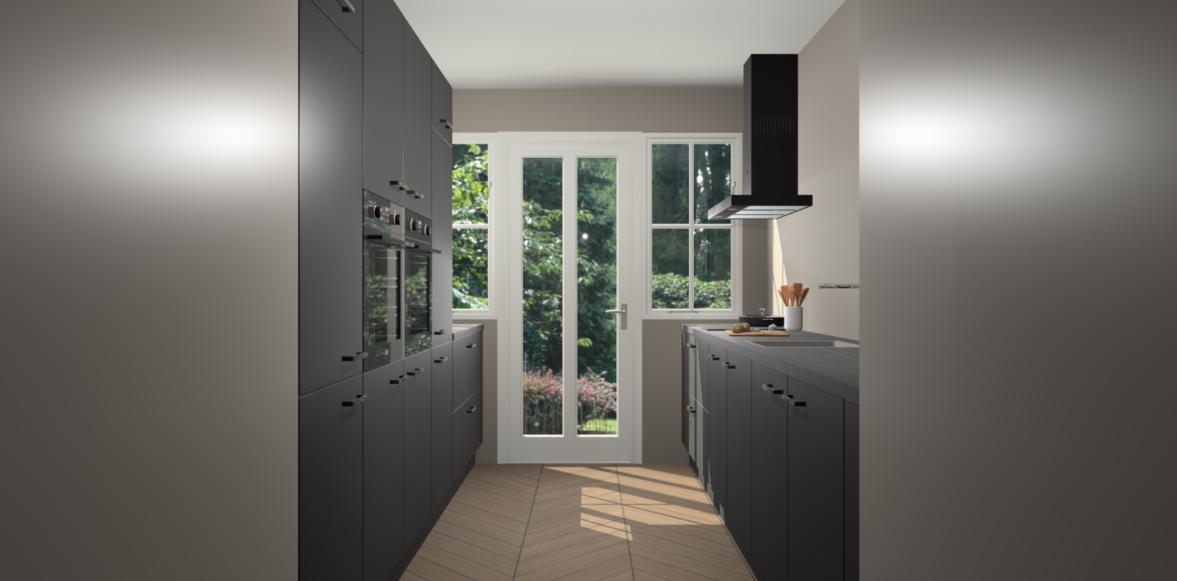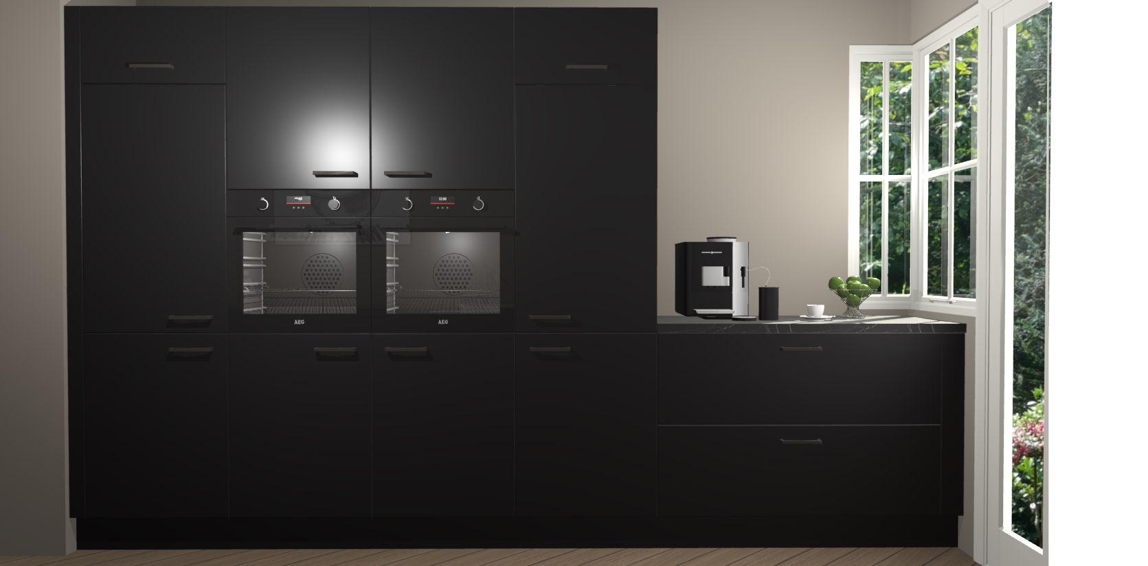 Een stijlvolle en praktische keuken als deze mag gezien worden. Dankzij de prachtige zwarte matte afwerking wordt de keuken gemakkelijk het middelpunt van uw huis - hij ziet er geweldig uit onder allerlei lichtomstandigheden, van dag tot nacht!