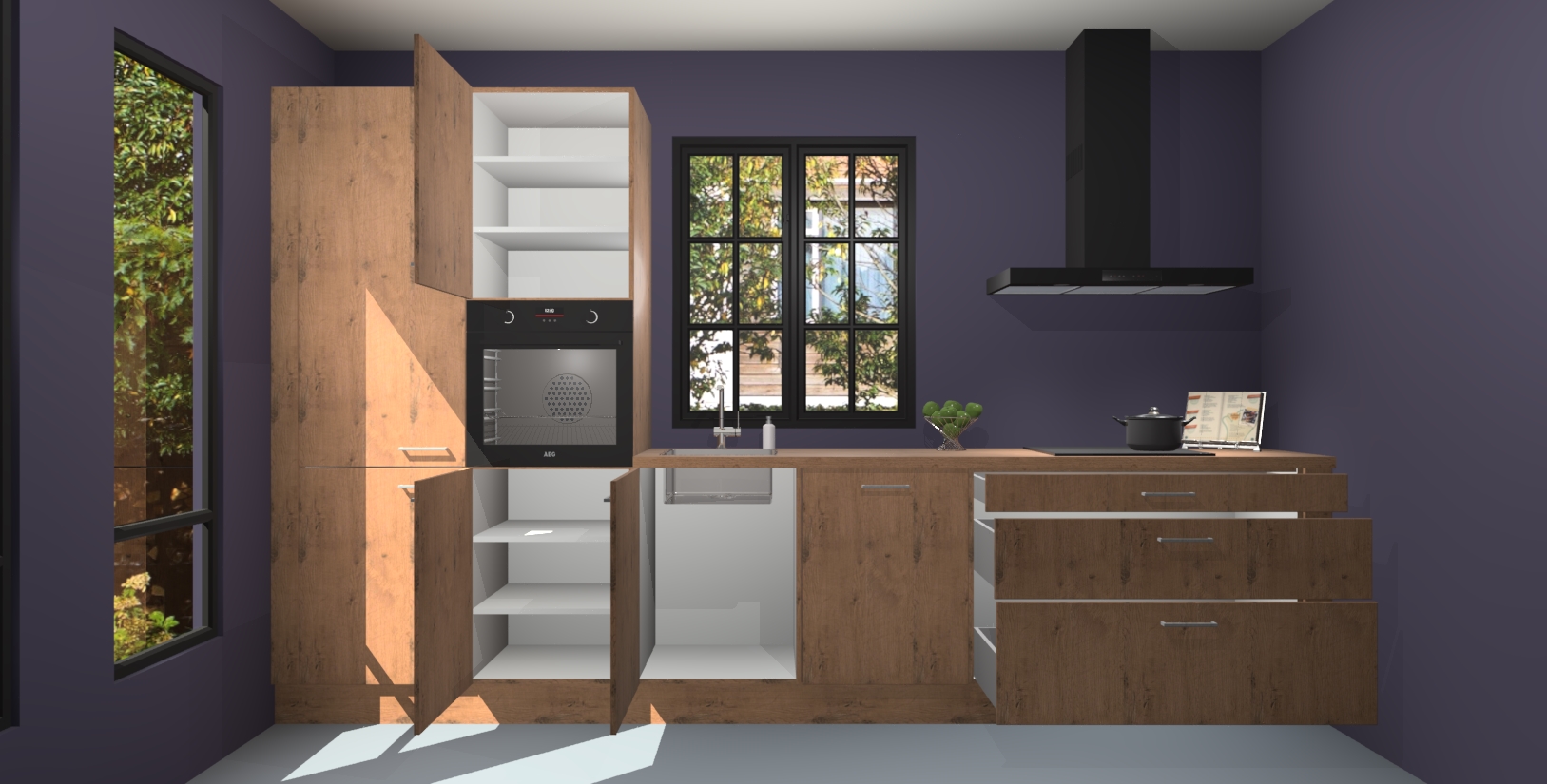 Dit ontwerp ziet er niet alleen stralend en uitnodigend uit, maar bevat ook 5 inbouwapparaten: een oven, inductiekookplaat, afzuigkap, vaatwasser en koelkast - die u desgewenst allemaal eenvoudig kunt upgraden naar een krachtige AEG na bestellen. Er zijn ook handige deuren met zachte sluiting - zodat u uw gezin niet wakker maakt als u 's avonds laat in de keuken bezig bent! En de kasten worden zelfs voorgemonteerd geleverd voor nog meer gemak.