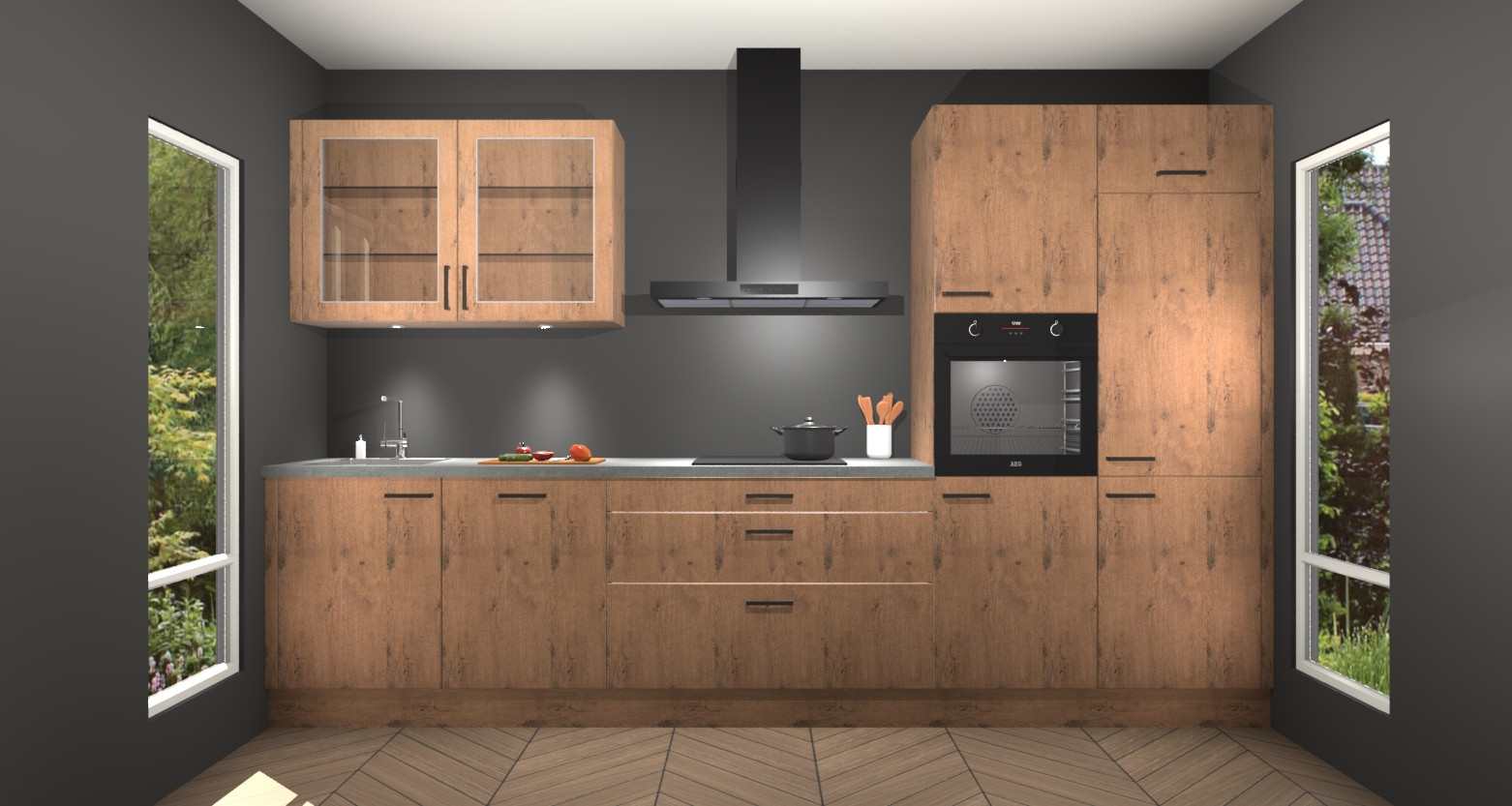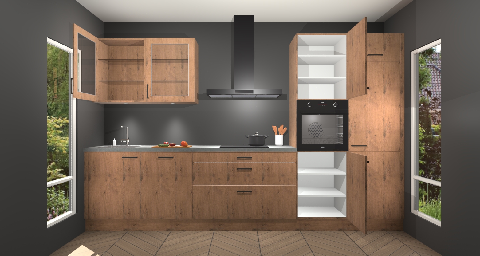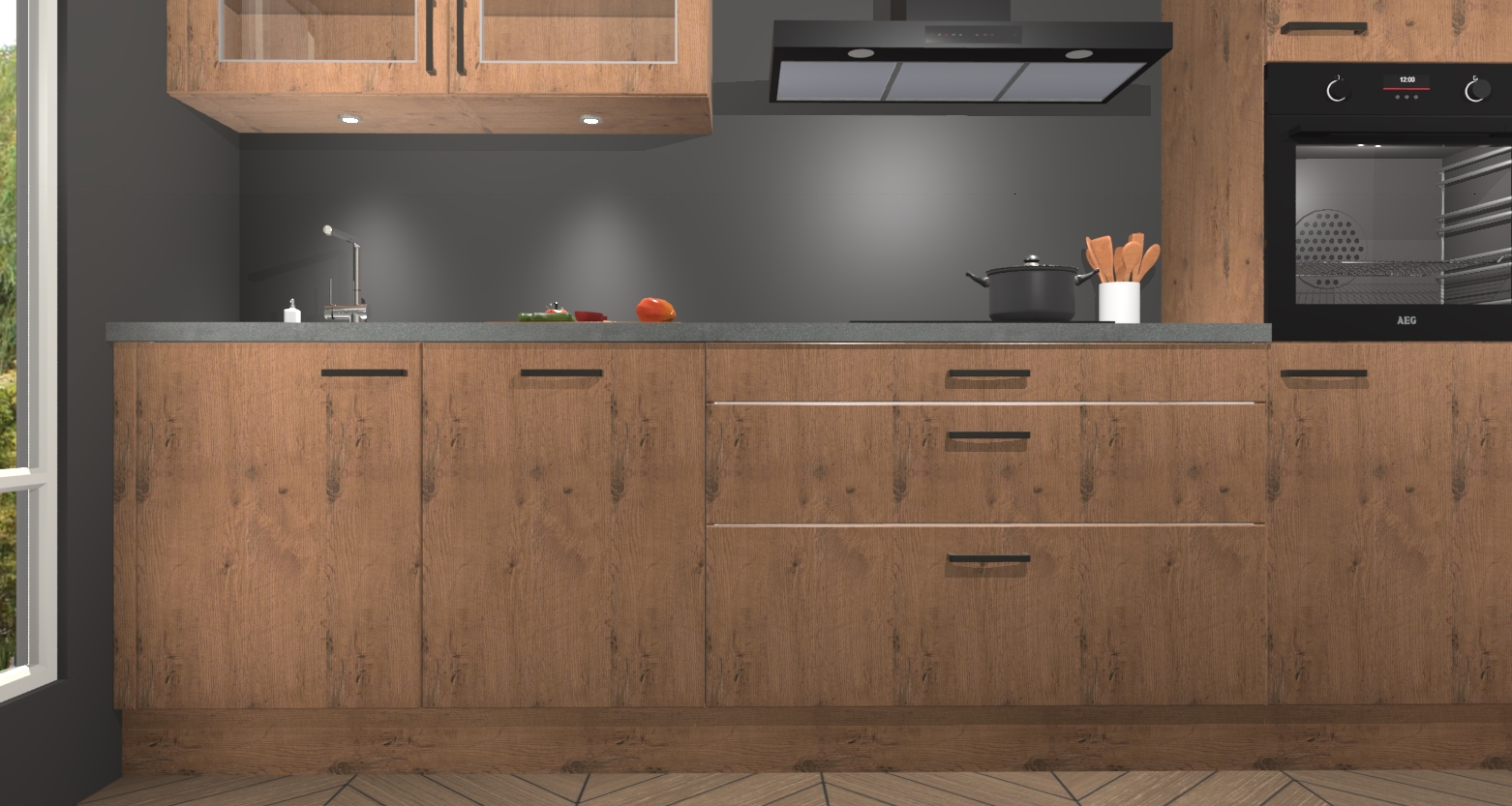 De astoria eiken keuken Cairo is de perfecte mix van modern en tijdloos design. Met zijn prachtige glazen deuren op de bovenkastjes voegt hij echt iets speciaals en unieks toe aan elke keuken. En met vijf ingebouwde apparaten inbegrepen - een oven, inductiekookplaat, afzuigkap, vaatwasser en koelkast - kunt u deze keuken echt helemaal van uzelf maken! U kunt na bestelling ook upgraden naar AEG voor een nog hogere kwaliteitservaring.