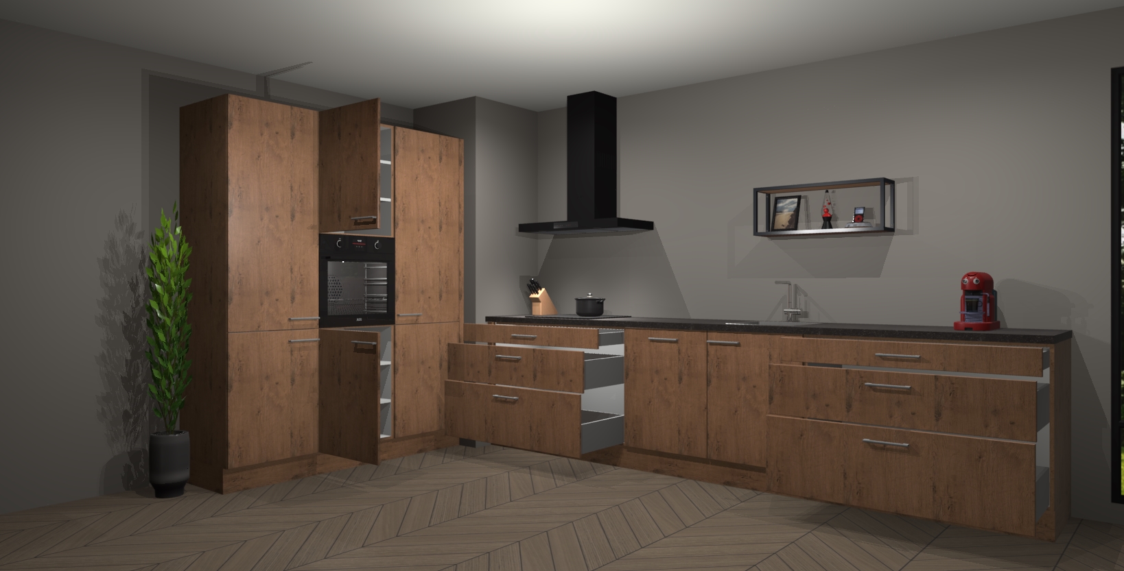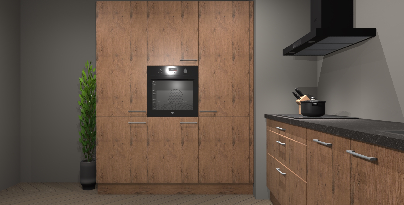 De softclose deuren openen en sluiten is ook heel eenvoudig - geniet van een moeiteloze keukenervaring, zelfs als er kinderen rondlopen. Voor extra gemak bij het plaatsen van uw bestelling bieden we ook een upgrade naar een kookplaat met geïntegreerde afzuiging.