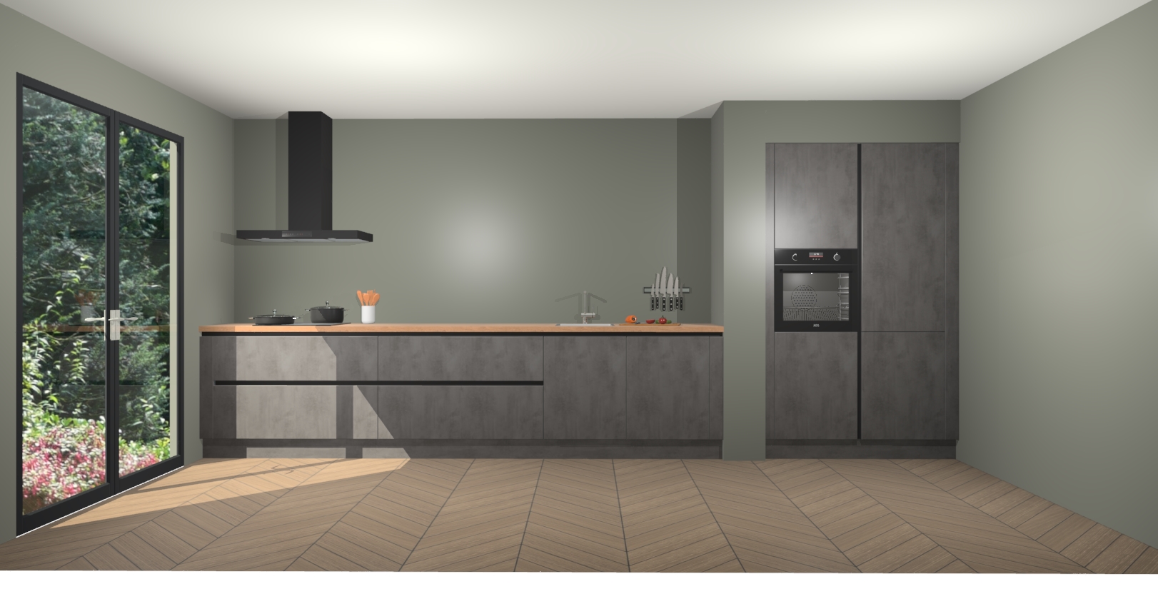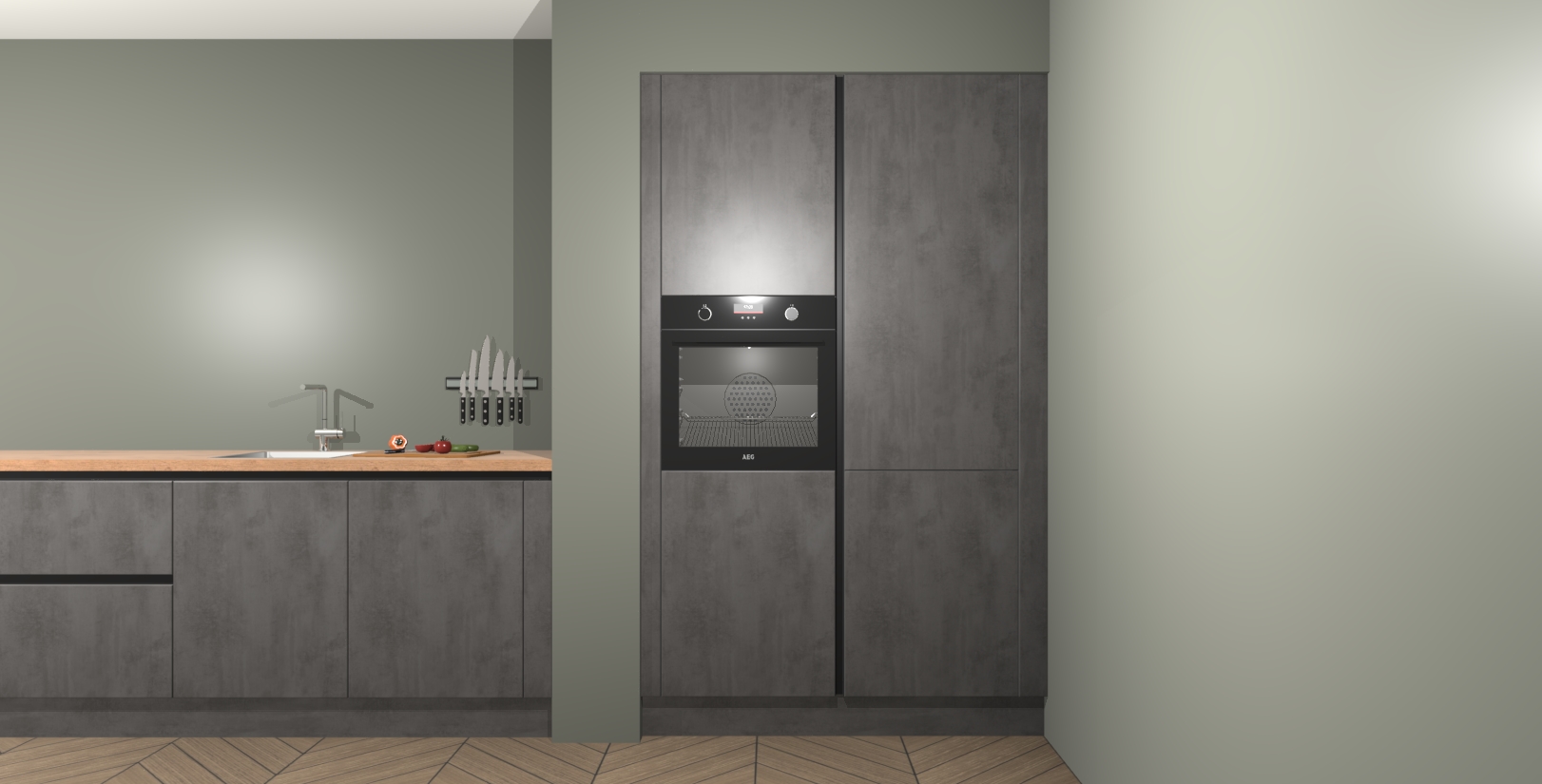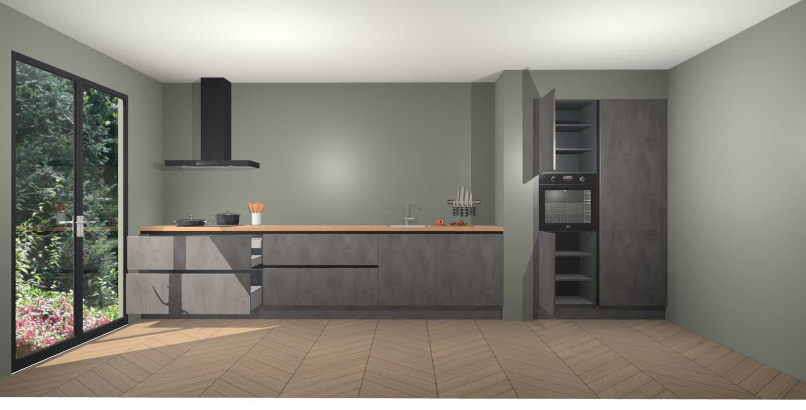 Met de Beton Antraciet greeploze keuken Calgary Maakt u van uw keuken het pronkstuk van uw huis. Stijlvol en toch praktisch, de nieuwste look voor wie meer waarde en charme aan zijn huis wil toevoegen. Met prachtige handgrepen die zich lenen voor een klassieke stijlbron, zal u niet teleurgesteld zijn in het resultaat. De soft-close deurscharnieren geven een gevoel van luxe omdat ze zachtjes bewegen zonder storende of krakende geluiden te veroorzaken.