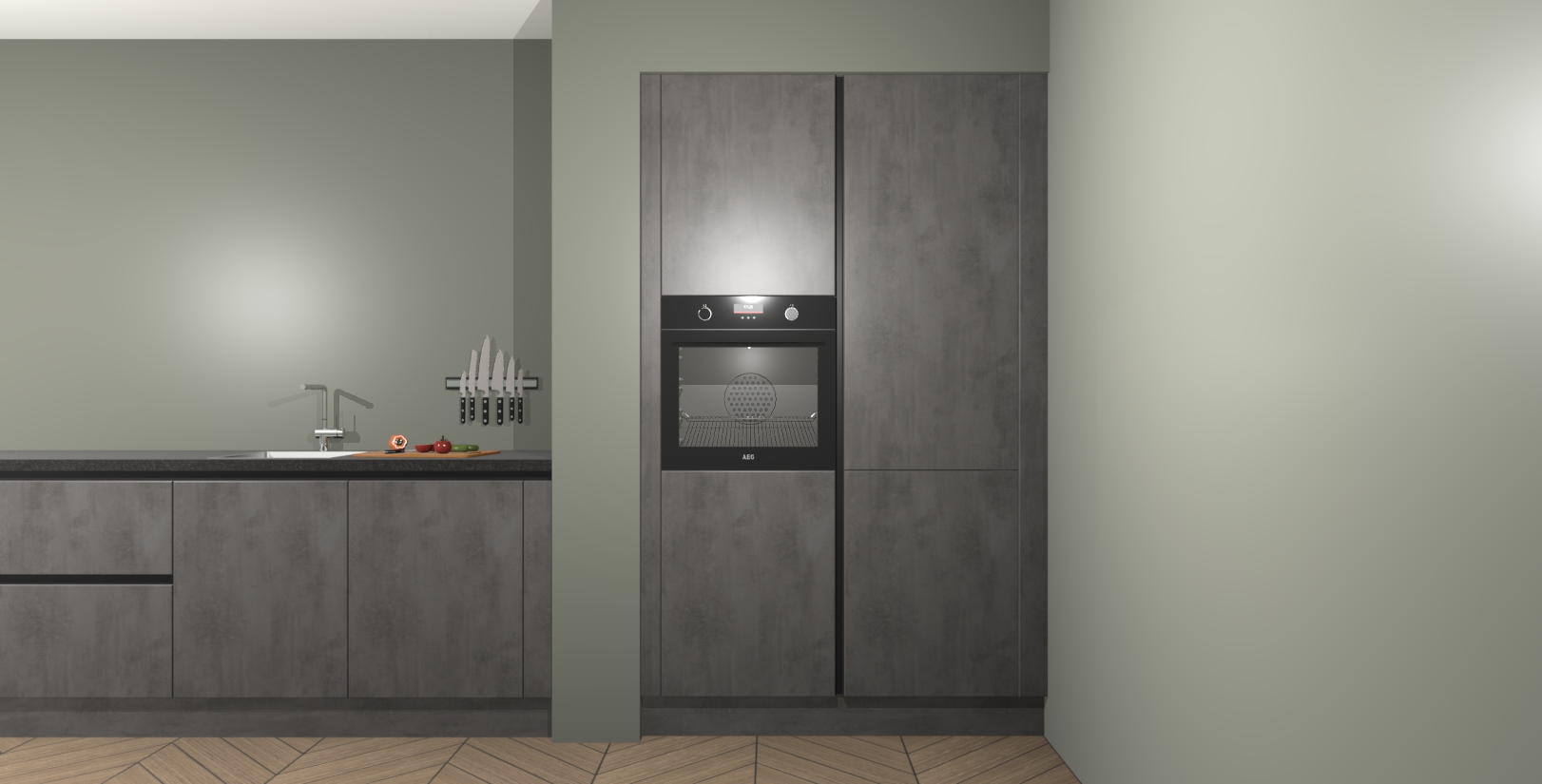 Met de Beton Antraciet greeploze keuken Calgary Maakt u van uw keuken het pronkstuk van uw huis. Stijlvol en toch praktisch, de nieuwste look voor wie meer waarde en charme aan zijn huis wil toevoegen. Met prachtige handgrepen die zich lenen voor een klassieke stijlbron, zal u niet teleurgesteld zijn in het resultaat. De soft-close deurscharnieren geven een gevoel van luxe omdat ze zachtjes bewegen zonder storende of krakende geluiden te veroorzaken.