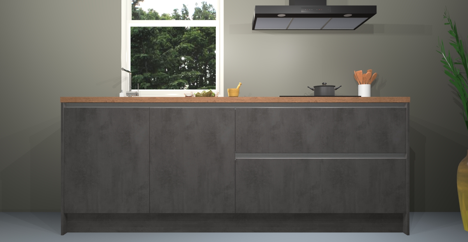 De Beton antraciet greeploze keuken Monaco heeft voldoende opbergruimte om uw keukenbenodigdheden georganiseerd en netjes te houden. Geniet van het gemak van de soft-close deuren, die deze stijlvolle look perfect afmaken. Maar dat is nog niet alles. Met de Beton antraciet greeploze keuken Monaco krijgt u maar liefst 5 ingebouwde apparaten: een oven, inductiekookplaat, afzuigkap, vaatwasser en koelkast. Deze kunnen gemakkelijk worden geüpgraded naar AEG als ze besteld zijn.