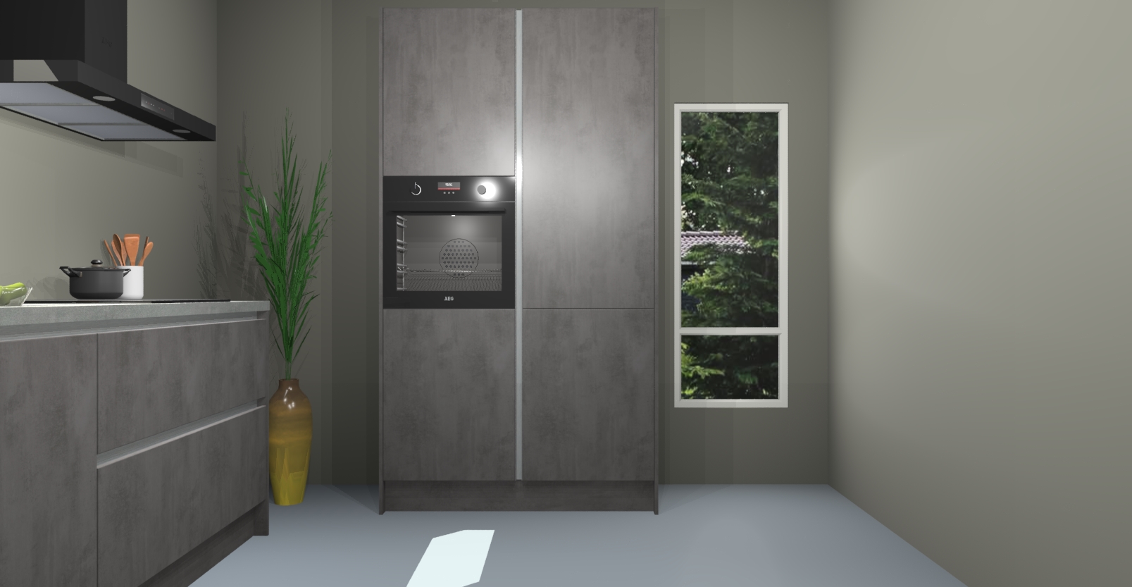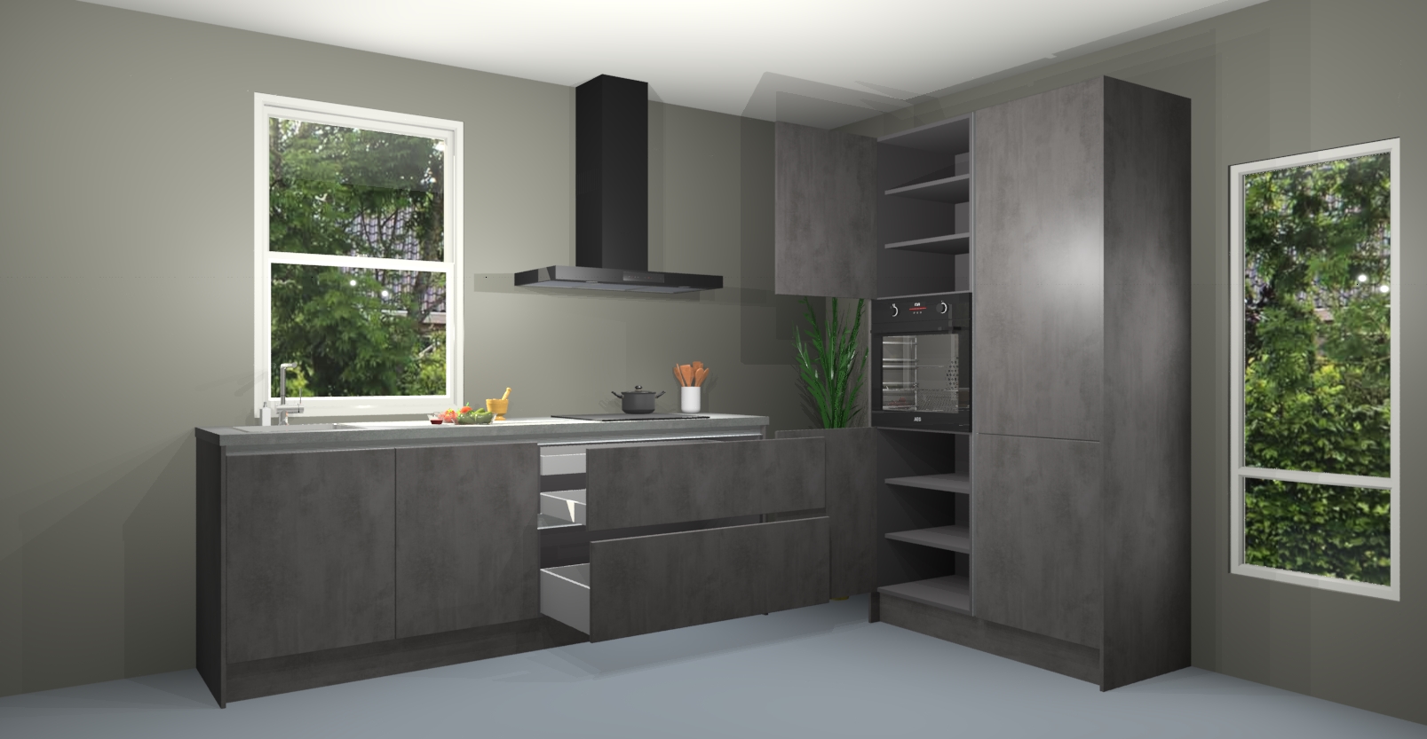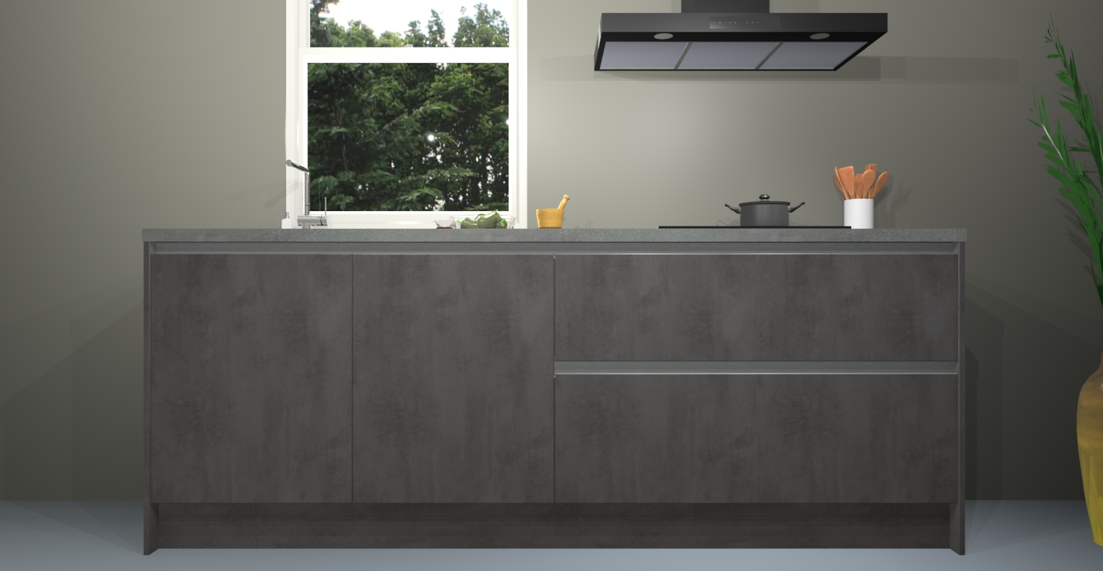 De Beton antraciet greeploze keuken Monaco heeft voldoende opbergruimte om uw keukenbenodigdheden georganiseerd en netjes te houden. Geniet van het gemak van de soft-close deuren, die deze stijlvolle look perfect afmaken. Maar dat is nog niet alles. Met de Beton antraciet greeploze keuken Monaco krijgt u maar liefst 5 ingebouwde apparaten: een oven, inductiekookplaat, afzuigkap, vaatwasser en koelkast. Deze kunnen gemakkelijk worden geüpgraded naar AEG als ze besteld zijn.