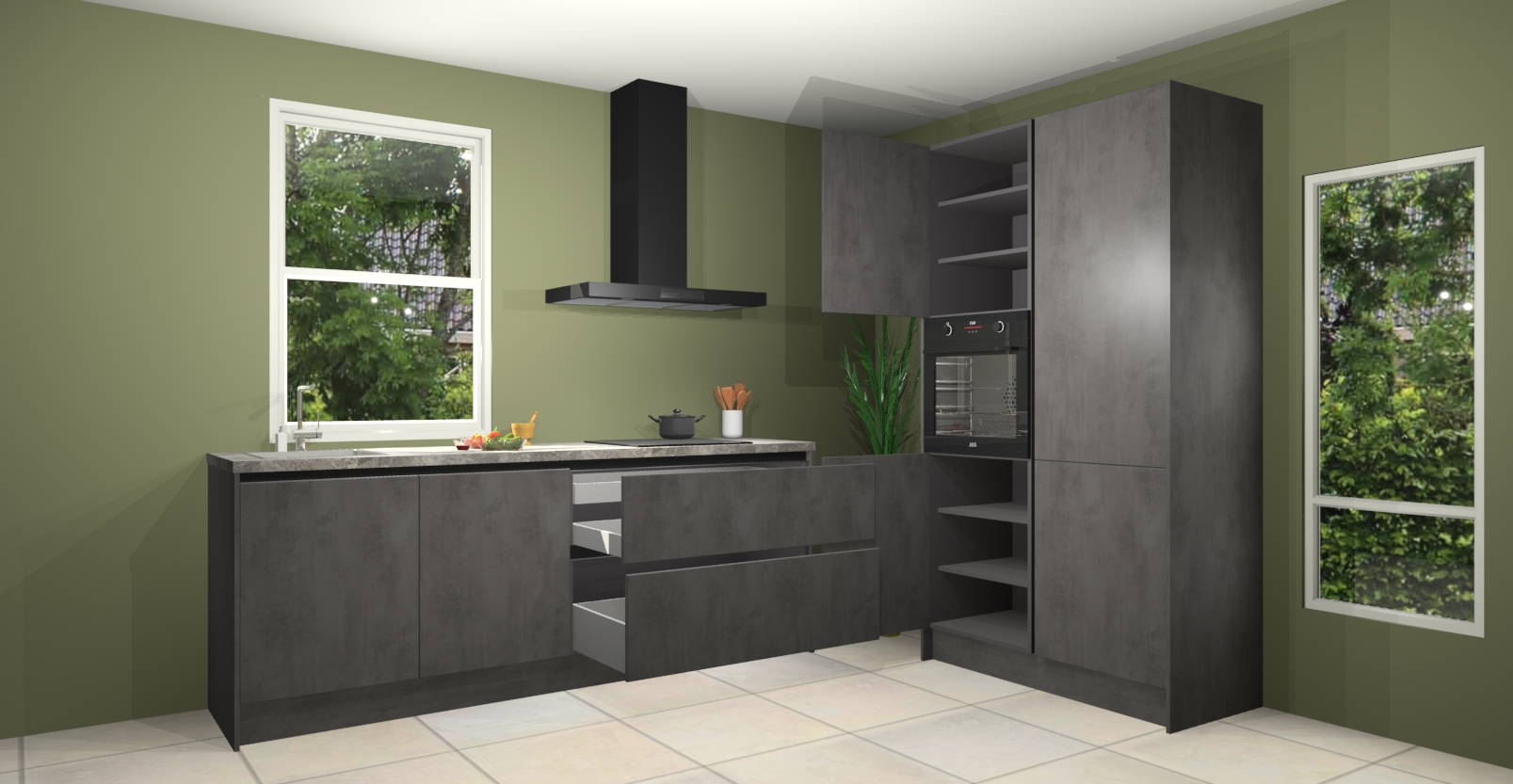Ervaar het ultieme gevoel van warmte en gezelligheid in uw huis met de luxe Beton antraciet greeploze keuken Monaco! Deze ongelooflijk sfeervolle houtlook straalt heerlijke warmte uit en tovert elke keuken om tot een gezellig familiecentrum. Breng uw dromen tot leven met deze unieke keuken, ontworpen voor moeiteloze luxe en functionaliteit.