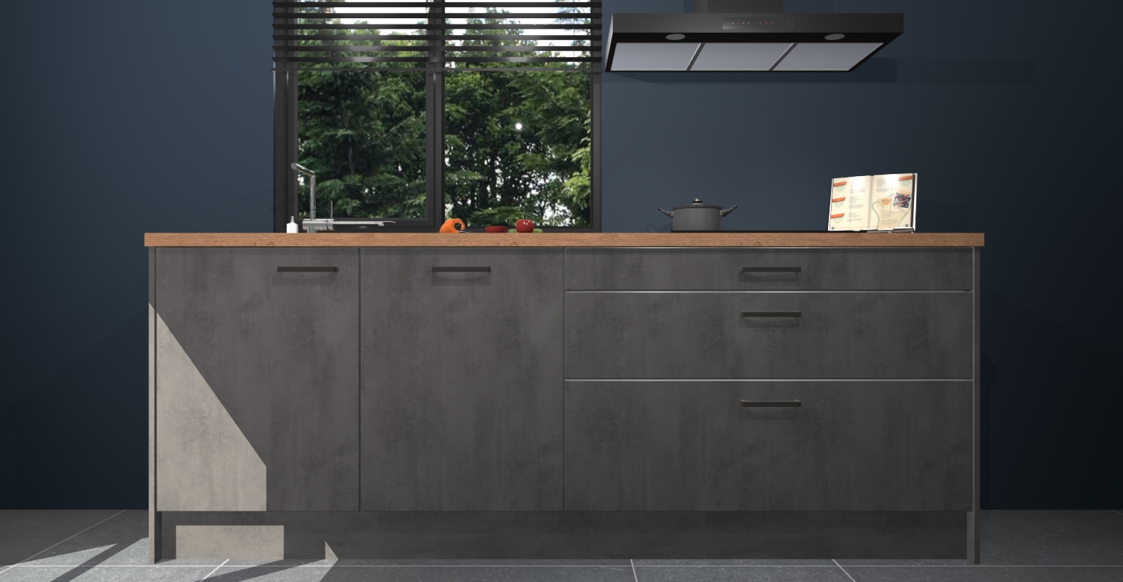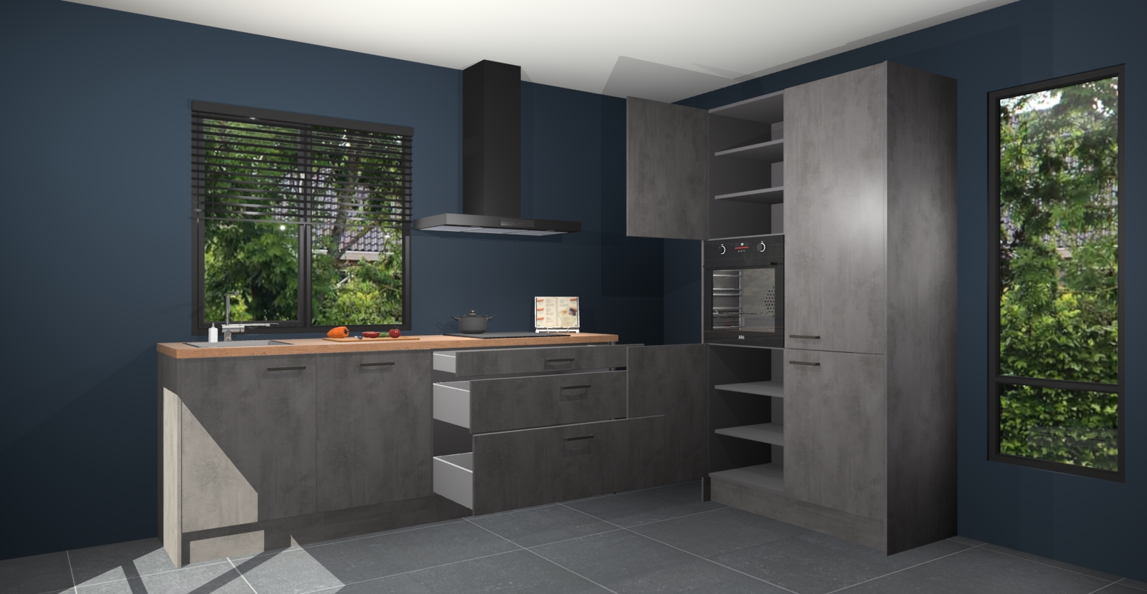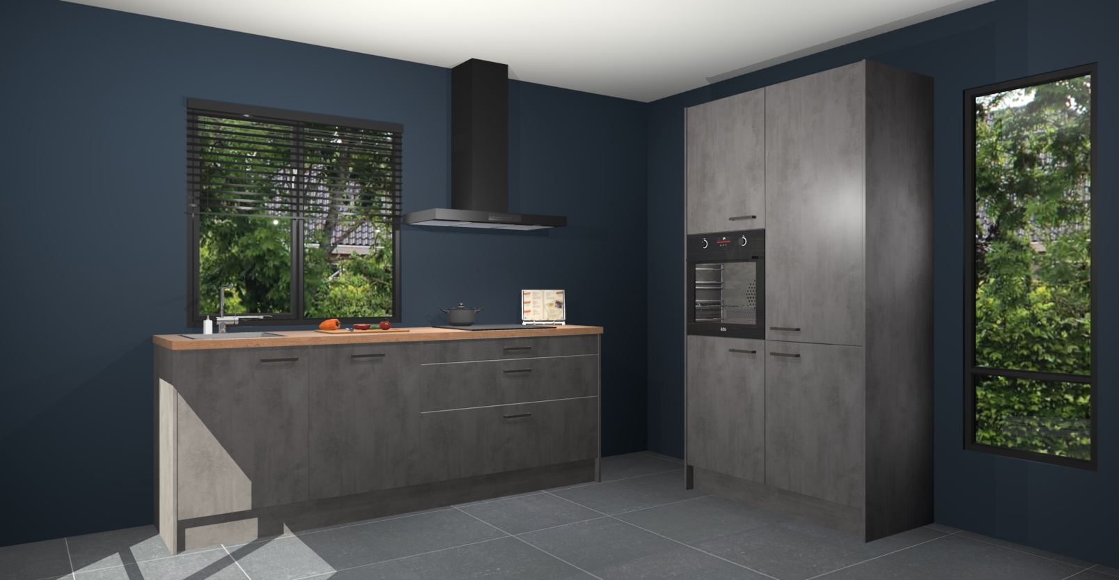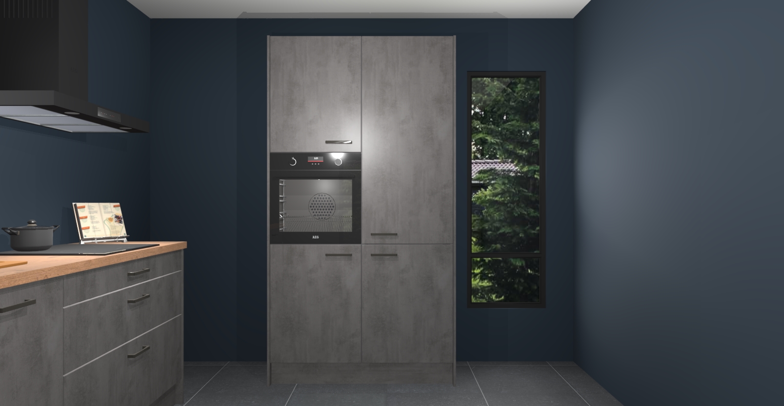 De setting is compleet gemaakt door de vijf inbouwapparaten: wanneer u gaat bestellen kunt u upgraden naar AEG-apparaten als oven, inductieplaat, afzuigkap, vaatwasser en koelkast. Kiest u voor onze Beton antraciet keuken Monaco, dan weet u zeker dat u te maken heeft met Duitse kwaliteit. Bovendien is er altijd sprake van een lage prijs en profiteren we aantrekkelijk leveringstermijn: die bedraagt slechts 7 weken ! Om het extra makkelijk te maken worden de keukenkasten reeds voorgemonteerd geleverd.