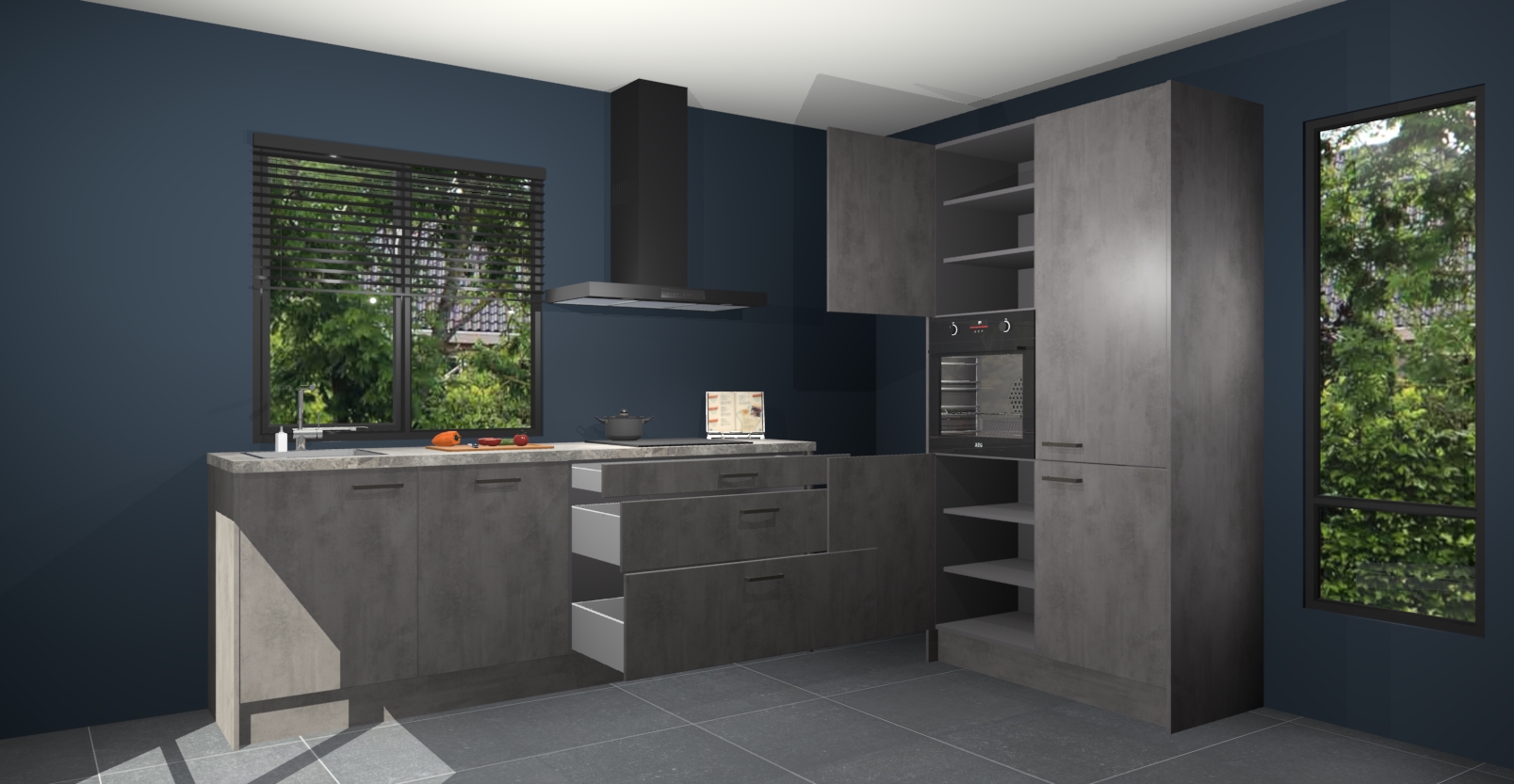 De setting is compleet gemaakt door de vijf inbouwapparaten: wanneer u gaat bestellen kunt u upgraden naar AEG-apparaten als oven, inductieplaat, afzuigkap, vaatwasser en koelkast. Kiest u voor onze Beton antraciet keuken Monaco, dan weet u zeker dat u te maken heeft met Duitse kwaliteit. Bovendien is er altijd sprake van een lage prijs en profiteren we aantrekkelijk leveringstermijn: die bedraagt slechts 7 weken ! Om het extra makkelijk te maken worden de keukenkasten reeds voorgemonteerd geleverd.