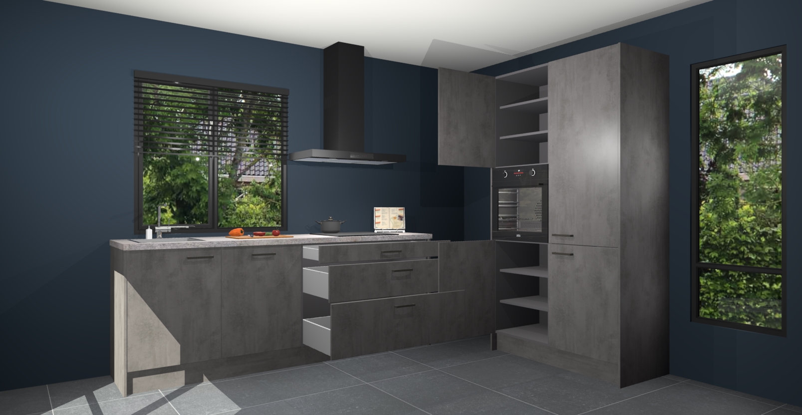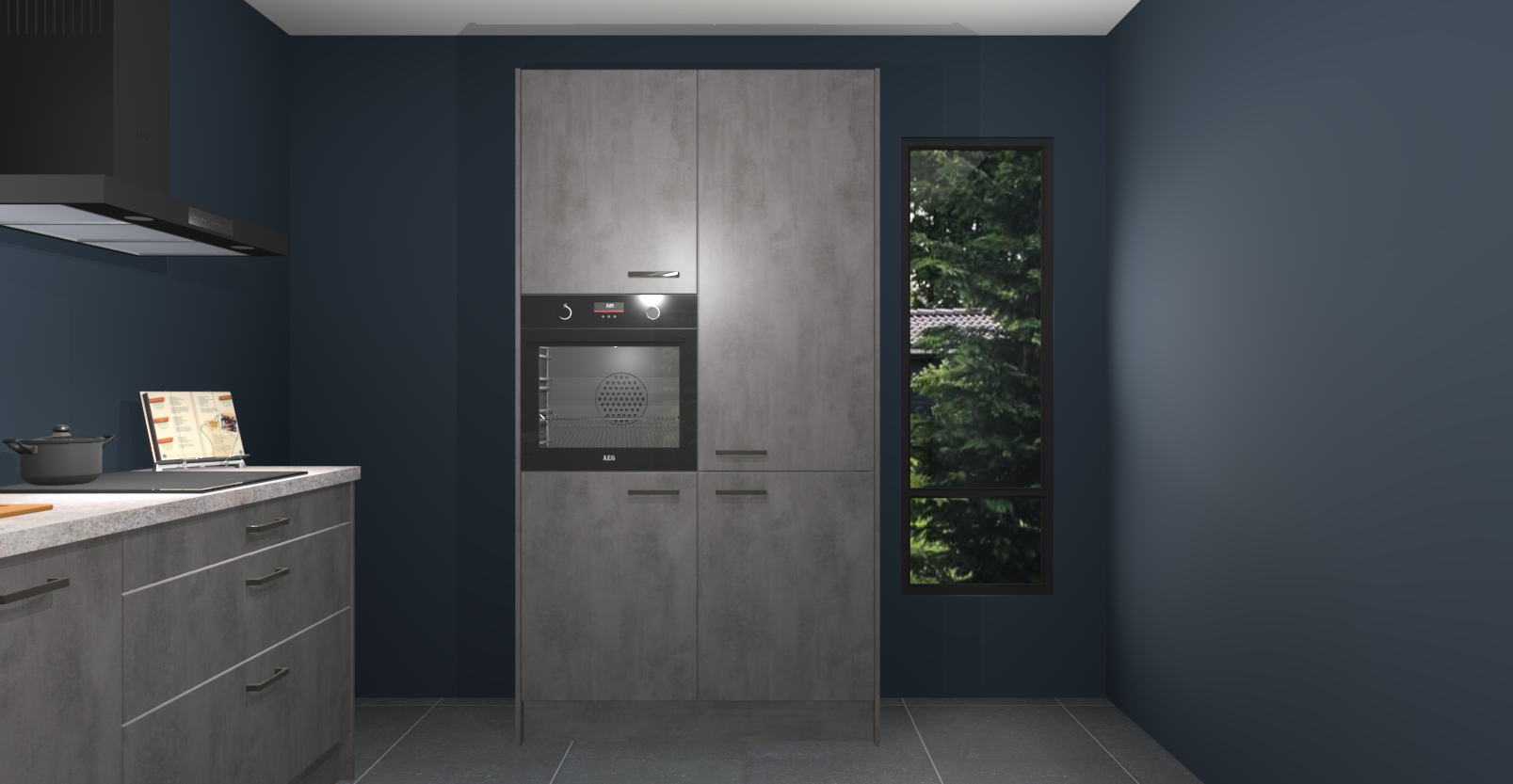 De setting is compleet gemaakt door de vijf inbouwapparaten: wanneer u gaat bestellen kunt u upgraden naar AEG-apparaten als oven, inductieplaat, afzuigkap, vaatwasser en koelkast. Kiest u voor onze Beton antraciet keuken Monaco, dan weet u zeker dat u te maken heeft met Duitse kwaliteit. Bovendien is er altijd sprake van een lage prijs en profiteren we aantrekkelijk leveringstermijn: die bedraagt slechts 7 weken ! Om het extra makkelijk te maken worden de keukenkasten reeds voorgemonteerd geleverd.