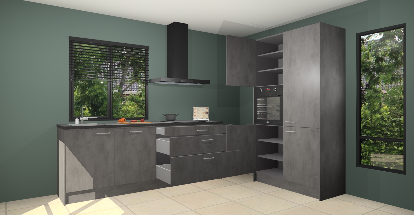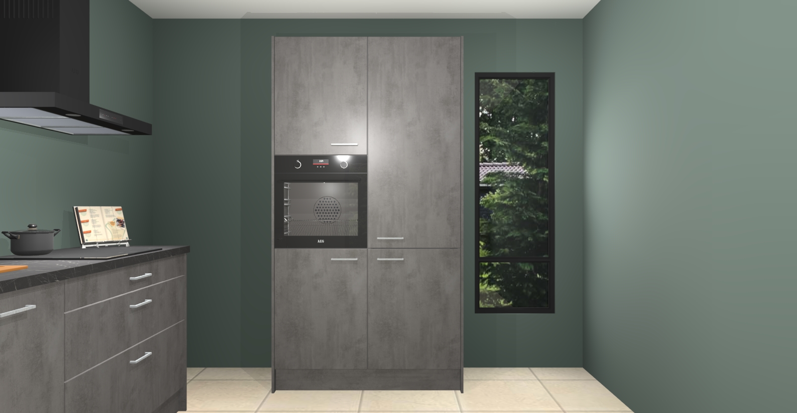 De setting is compleet gemaakt door de vijf inbouwapparaten: wanneer u gaat bestellen kunt u upgraden naar AEG-apparaten als oven, inductieplaat, afzuigkap, vaatwasser en koelkast. Kiest u voor onze Beton antraciet keuken Monaco, dan weet u zeker dat u te maken heeft met Duitse kwaliteit. Bovendien is er altijd sprake van een lage prijs en profiteren we aantrekkelijk leveringstermijn: die bedraagt slechts 7 weken ! Om het extra makkelijk te maken worden de keukenkasten reeds voorgemonteerd geleverd.