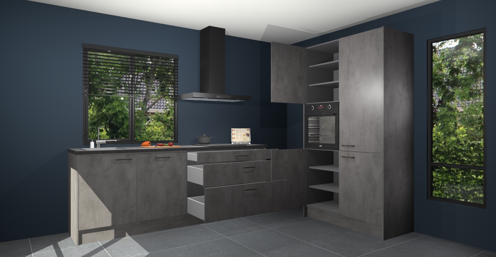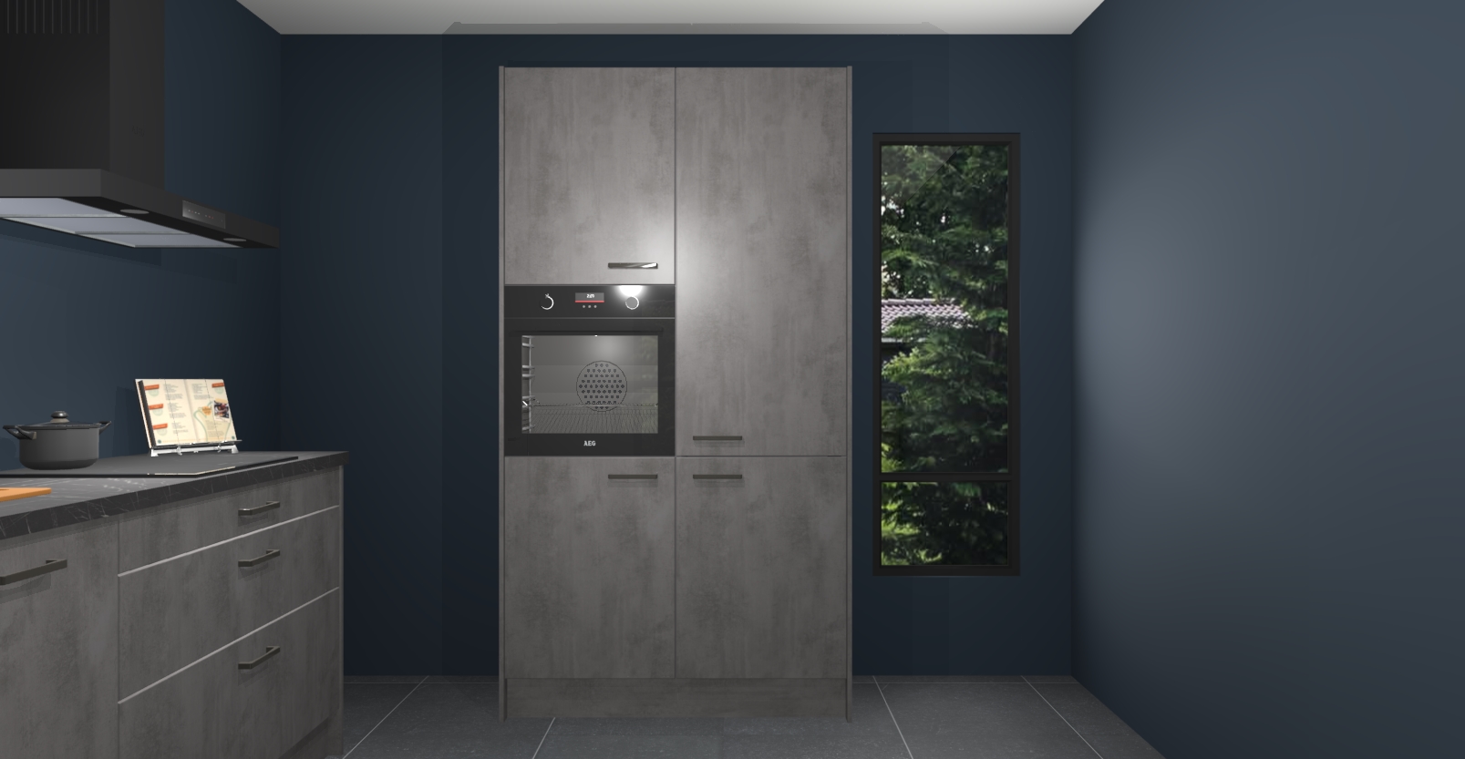De setting is compleet gemaakt door de vijf inbouwapparaten: wanneer u gaat bestellen kunt u upgraden naar AEG-apparaten als oven, inductieplaat, afzuigkap, vaatwasser en koelkast. Kiest u voor onze Beton antraciet keuken Monaco, dan weet u zeker dat u te maken heeft met Duitse kwaliteit. Bovendien is er altijd sprake van een lage prijs en profiteren we aantrekkelijk leveringstermijn: die bedraagt slechts 7 weken ! Om het extra makkelijk te maken worden de keukenkasten reeds voorgemonteerd geleverd.
