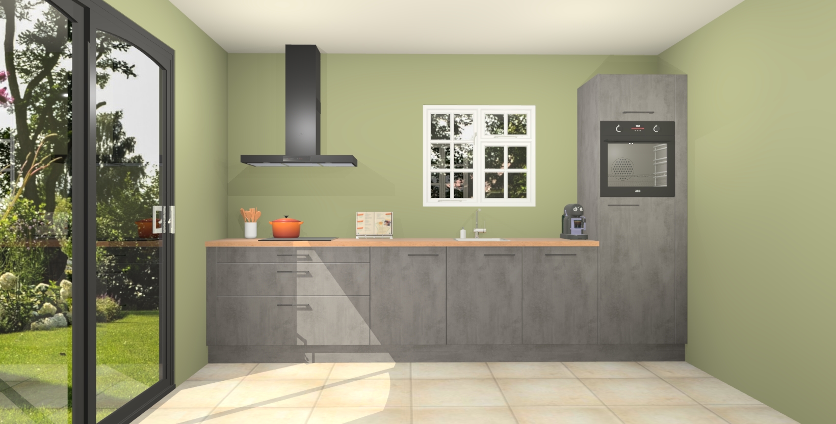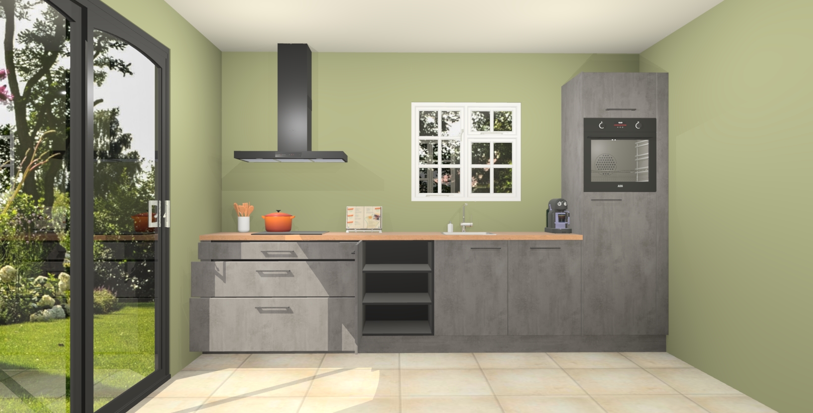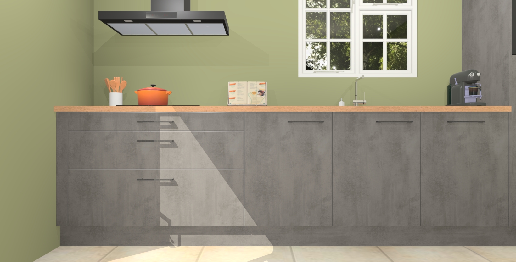 Maak kennis met de beton antraciet keuken Sofia: de perfecte mix van stijl en gemak. De keuken heeft vijf inbouw apparaten, plus een werkblad in houtlook dat meteen warmte en verfijning toevoegt.
