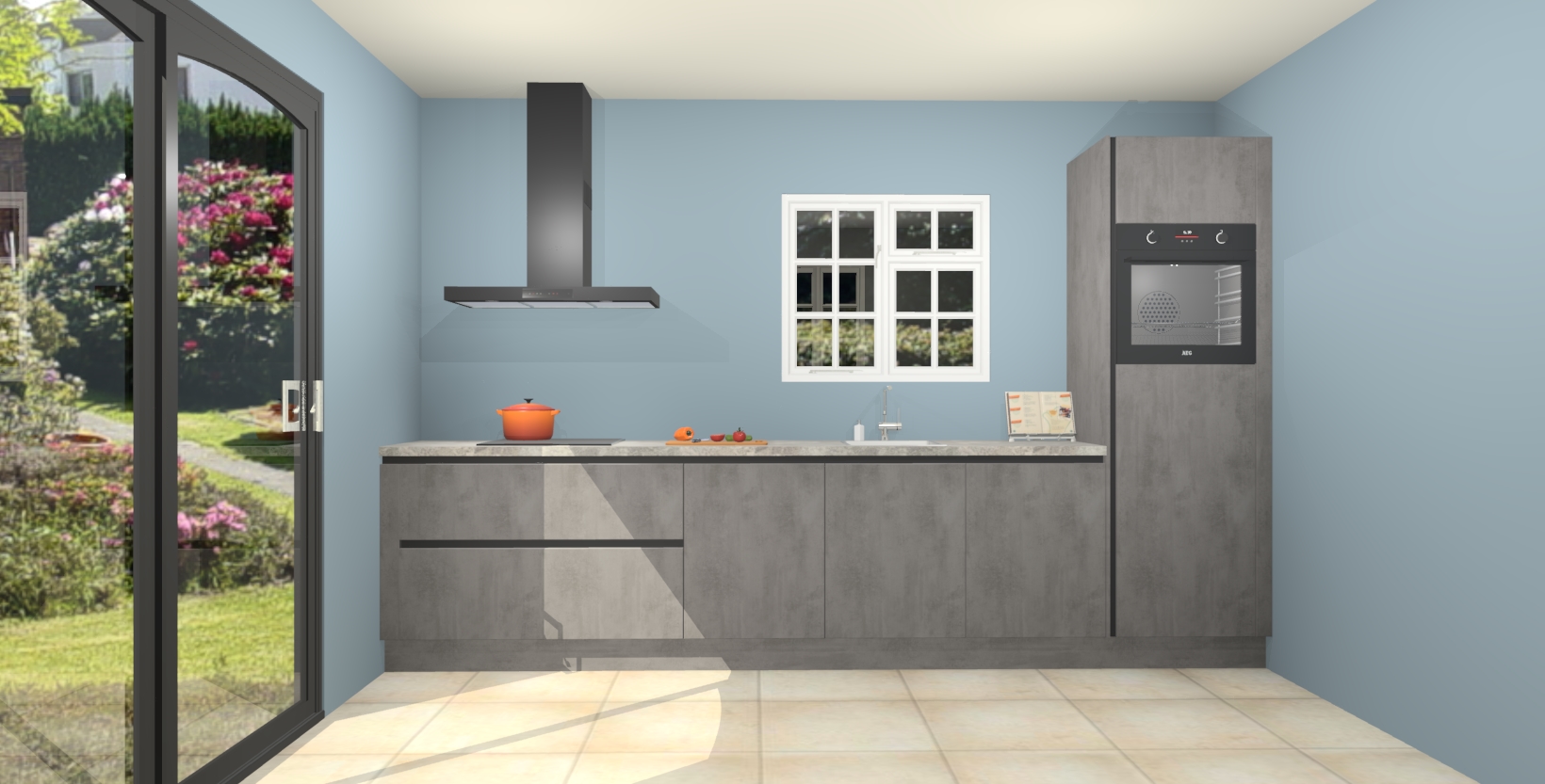 Maak kennis met de beton antraciet keuken Sofia: de perfecte mix van stijl en gemak. De keuken heeft vijf inbouw apparaten, plus een werkblad in houtlook dat meteen warmte en verfijning toevoegt.
