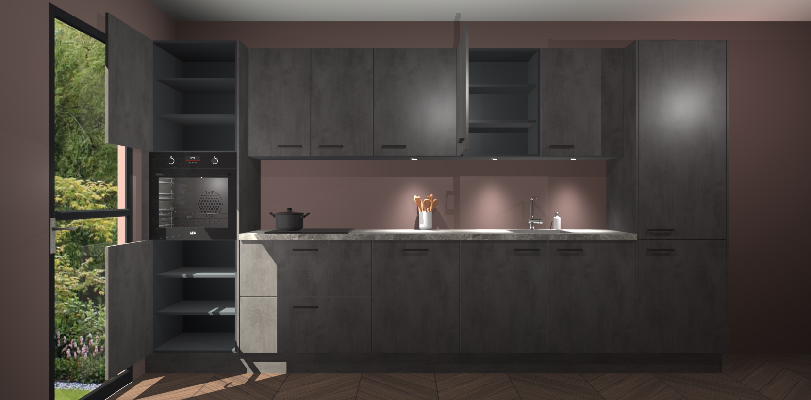 Dit is de perfecte keuken voor wie op zoek is naar een luxueuze stijl zonder zijn portemonnee te legen! Het chique ontwerp van de beton antraciet keuken Wels voegt dat vleugje verfijning toe aan elk huis. Het gemak van voorgemonteerde kasten bespaart u talloze uren tijd en energie, zodat u veel sneller dan verwacht kunt beginnen te genieten van uw prachtige nieuwe keuken. Bovendien bedraagt de levertijd slechts 7 weken.