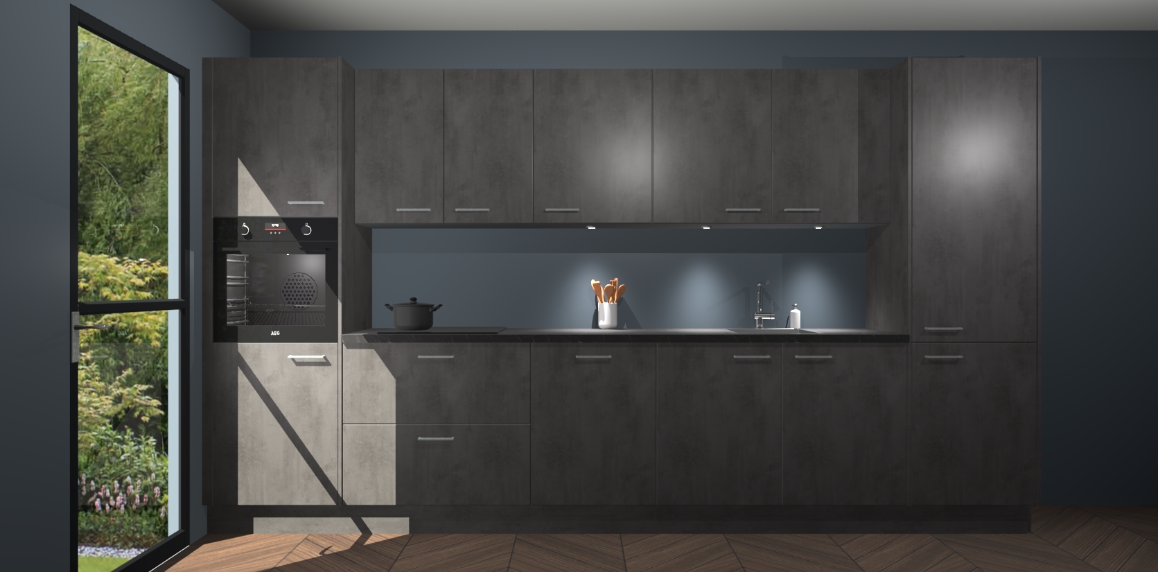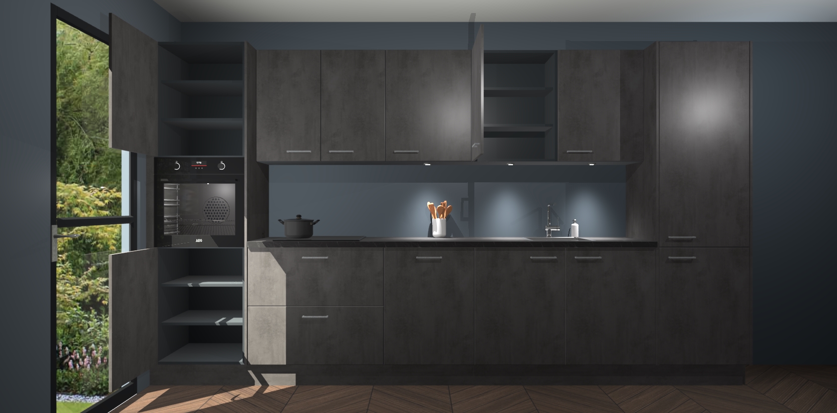 Dit is de perfecte keuken voor wie op zoek is naar een luxueuze stijl zonder zijn portemonnee te legen! Het chique ontwerp van de beton antraciet keuken Wels voegt dat vleugje verfijning toe aan elk huis. Het gemak van voorgemonteerde kasten bespaart u talloze uren tijd en energie, zodat u veel sneller dan verwacht kunt beginnen te genieten van uw prachtige nieuwe keuken. Bovendien bedraagt de levertijd slechts 7 weken.