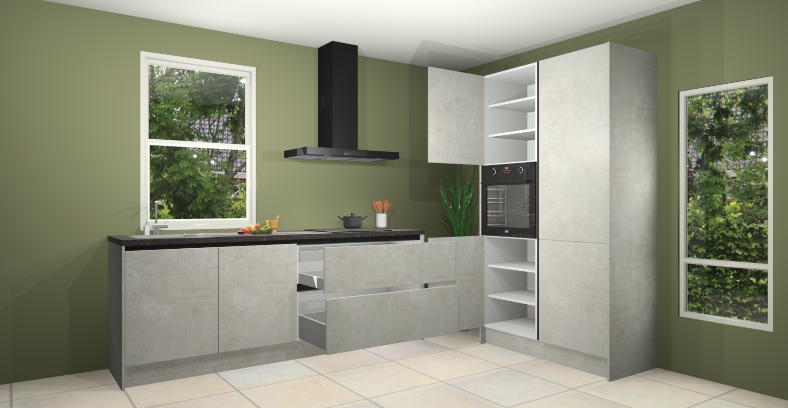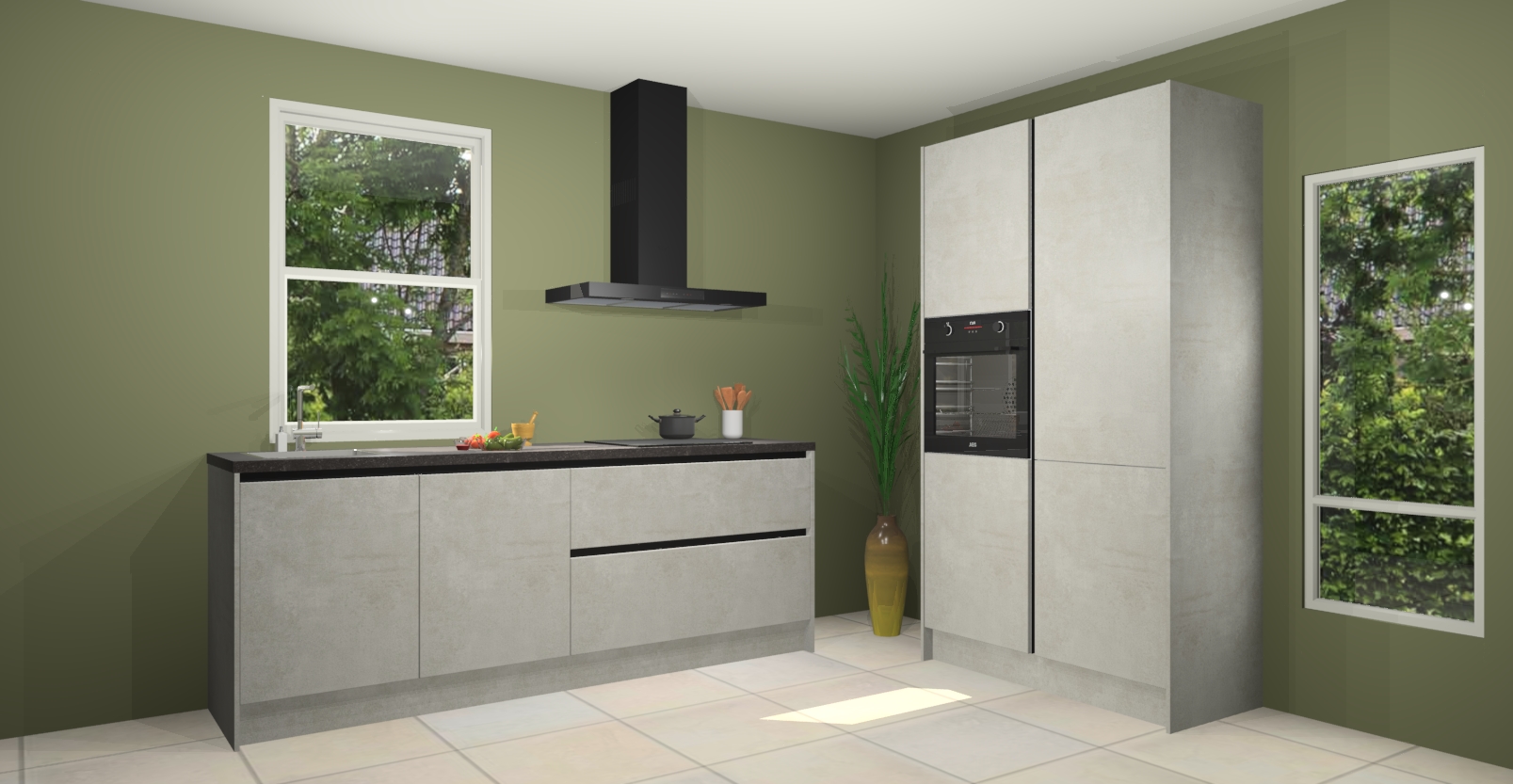 De Beton opaal greeploze keuken Monaco heeft voldoende opbergruimte om uw keukenbenodigdheden georganiseerd en netjes te houden. Geniet van het gemak van de soft-close deuren, die deze stijlvolle look perfect afmaken. Maar dat is nog niet alles. Met de Beton opaal greeploze keuken Monaco krijgt u maar liefst 5 ingebouwde apparaten: een oven, inductiekookplaat, afzuigkap, vaatwasser en koelkast. Deze kunnen gemakkelijk worden geüpgraded naar AEG als ze besteld zijn.