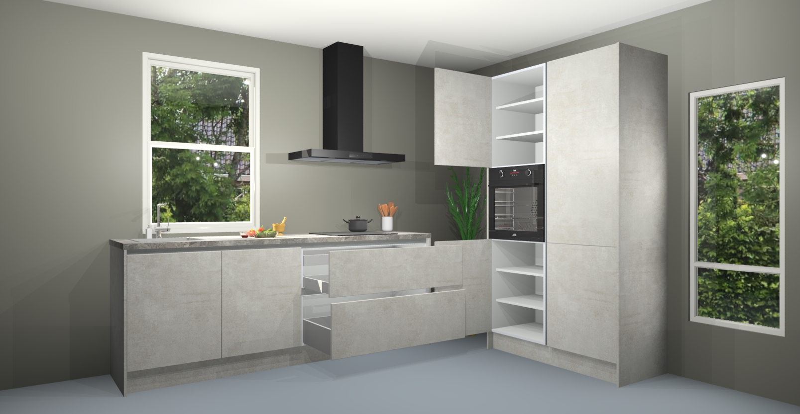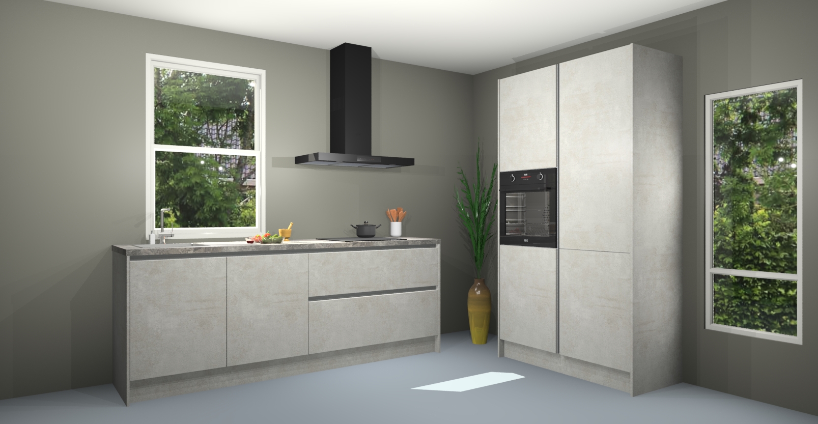 De Beton opaal greeploze keuken Monaco heeft voldoende opbergruimte om uw keukenbenodigdheden georganiseerd en netjes te houden. Geniet van het gemak van de soft-close deuren, die deze stijlvolle look perfect afmaken. Maar dat is nog niet alles. Met de Beton opaal greeploze keuken Monaco krijgt u maar liefst 5 ingebouwde apparaten: een oven, inductiekookplaat, afzuigkap, vaatwasser en koelkast. Deze kunnen gemakkelijk worden geüpgraded naar AEG als ze besteld zijn.