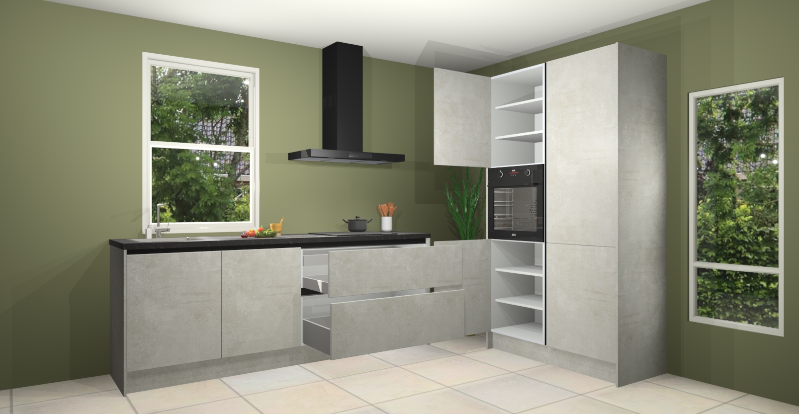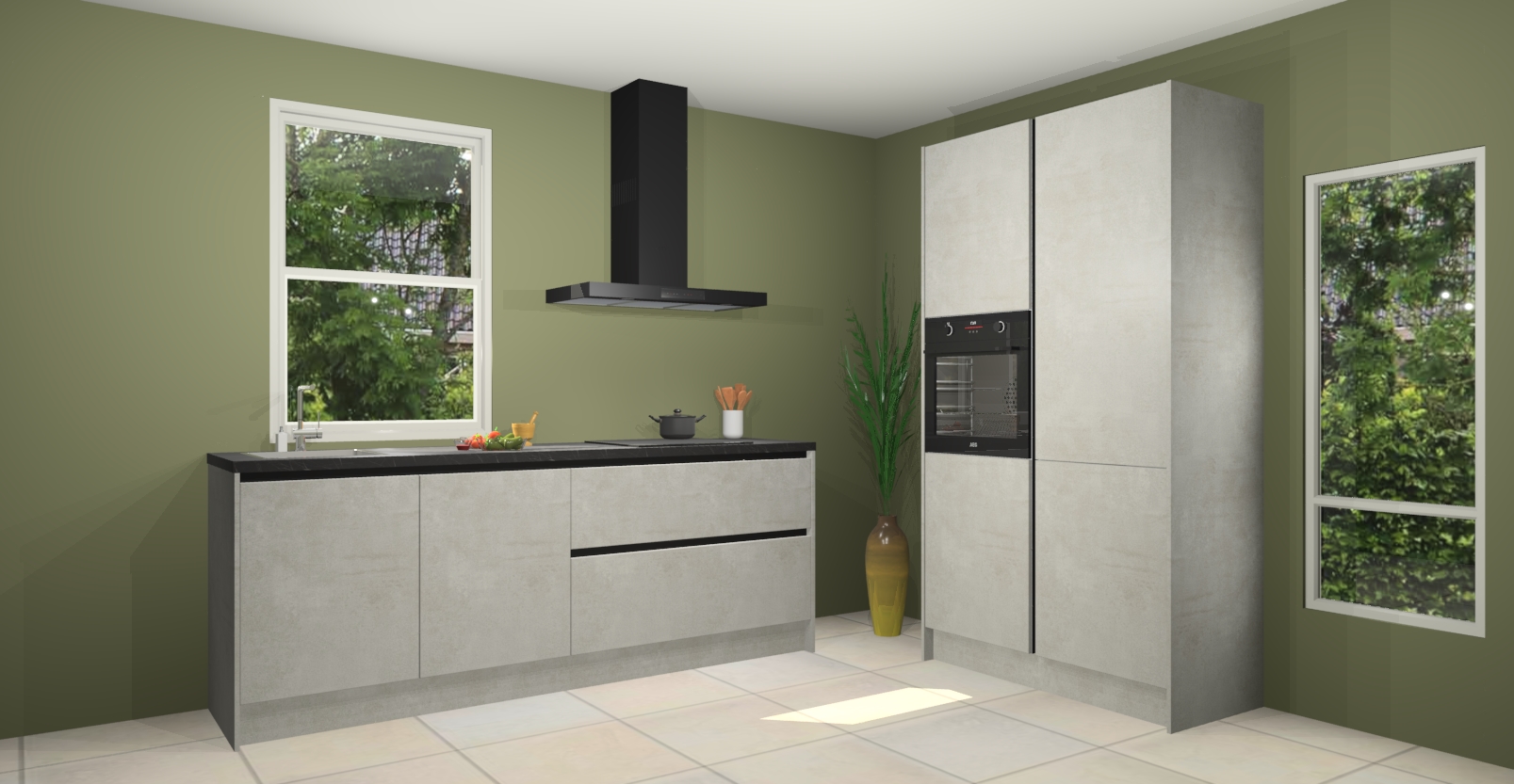 De Beton opaal greeploze keuken Monaco heeft voldoende opbergruimte om uw keukenbenodigdheden georganiseerd en netjes te houden. Geniet van het gemak van de soft-close deuren, die deze stijlvolle look perfect afmaken. Maar dat is nog niet alles. Met de Beton opaal greeploze keuken Monaco krijgt u maar liefst 5 ingebouwde apparaten: een oven, inductiekookplaat, afzuigkap, vaatwasser en koelkast. Deze kunnen gemakkelijk worden geüpgraded naar AEG als ze besteld zijn.