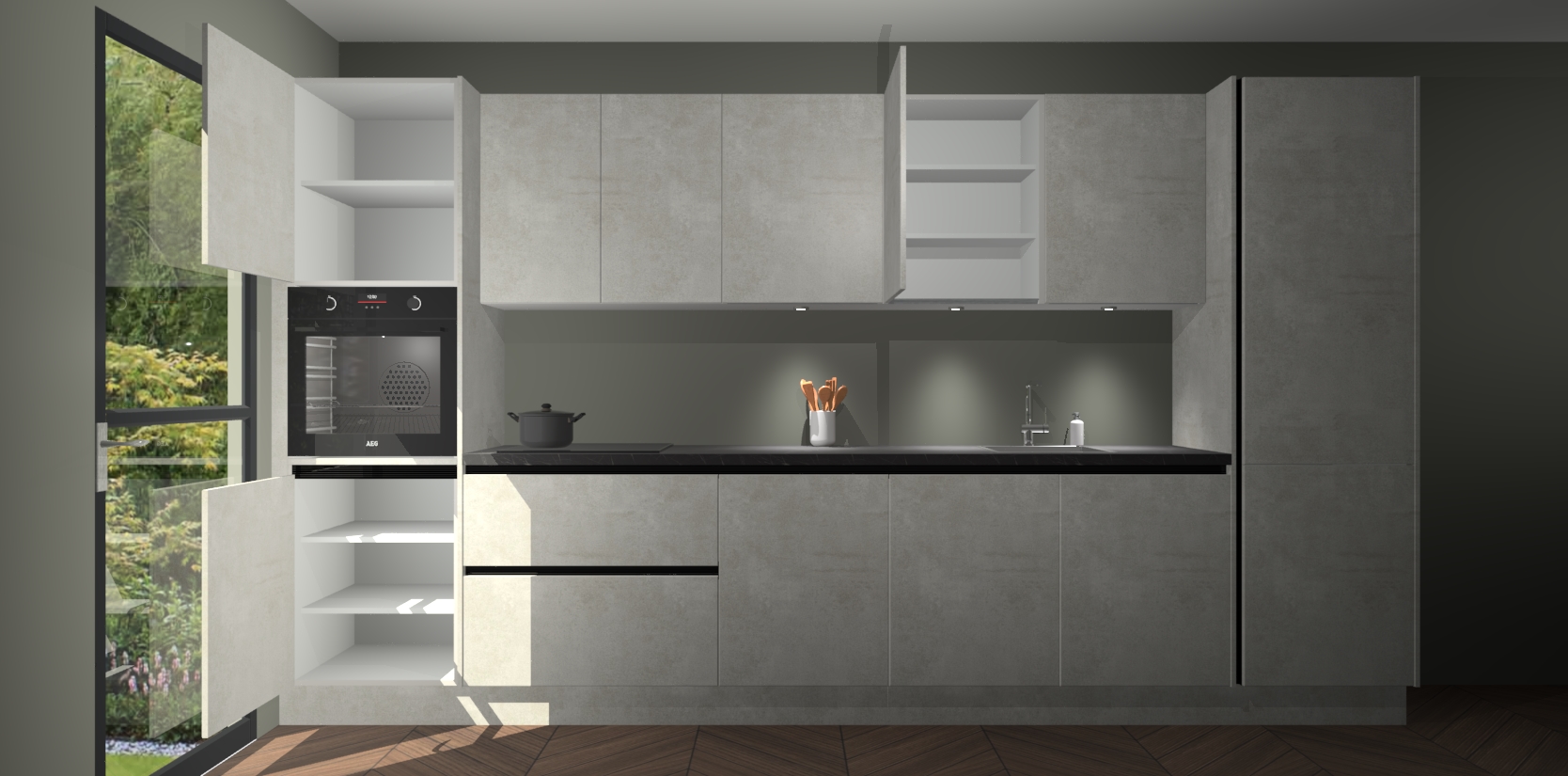 Dit is de perfecte keuken voor wie op zoek is naar een luxueuze stijl zonder zijn portemonnee te legen! Het chique ontwerp van de beton opaal greeploze keuken Wels voegt dat vleugje verfijning toe aan elk huis. Het gemak van voorgemonteerde kasten bespaart u talloze uren tijd en energie, zodat u veel sneller dan verwacht kunt beginnen te genieten van uw prachtige nieuwe keuken. Bovendien bedraagt de levertijd slechts 7 weken.
