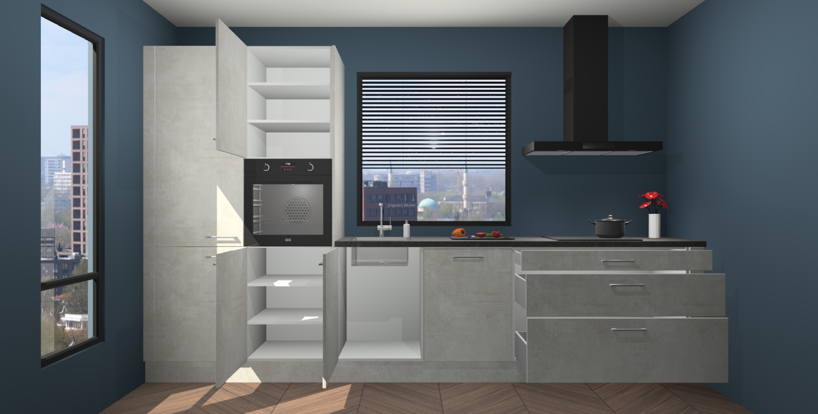 Met 5 geïntegreerde apparaten - oven, inductiekookplaat, afzuigkap, vaatwasser en koelkast - zorgt deze prachtige opstelling ervoor dat u alle benodigdheden hebt om uw favoriete gerechten te bereiden. Ze zijn voorzien van softclose deuren zodat u ze moeiteloos kunt openen en sluiten zonder schuren of lawaai.