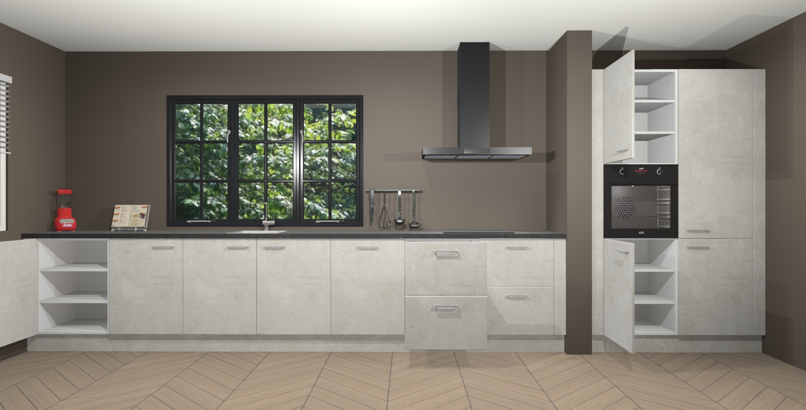 Met de Beton opaal keuken Elzas Maakt u van uw keuken het pronkstuk van uw huis. Stijlvol en toch praktisch, de nieuwste look voor wie meer waarde en charme aan zijn huis wil toevoegen. Met prachtige handgrepen die zich lenen voor een klassieke stijlbron, zal u niet teleurgesteld zijn in het resultaat. De soft-close deurscharnieren geven een gevoel van luxe omdat ze zachtjes bewegen zonder storende of krakende geluiden te veroorzaken.